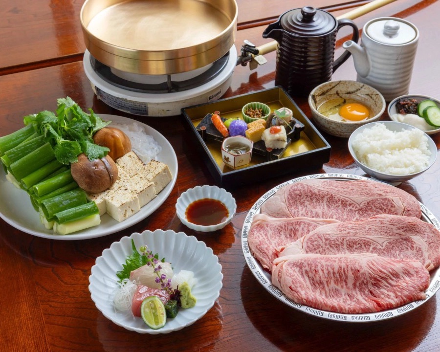 Seasonal appetizers, salt-grilled Kuroge Wagyu sirloin steak, sukiyaki, rice, and pickled side dishes