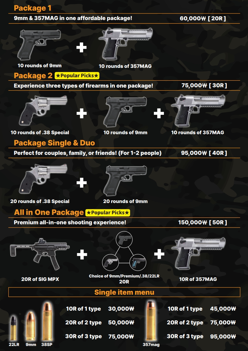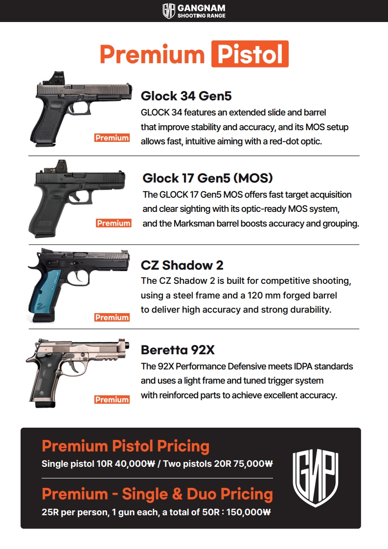 Gangnam Live-Fire Shooting Range started as an official Olympic shooting range in 2019, and will be certified as a live-fire shooting range by the Seoul Metropolitan Police Agency in 2022. It is comprised of coaches who are professional team shooters. In addition to providing police/security shooting lessons and shooting range training, it also operates a shooting range for beginners with no shooting experience to easily approach the sport of shooting and firearms. Enjoy shooting in Seoul, something you couldn’t normally do!