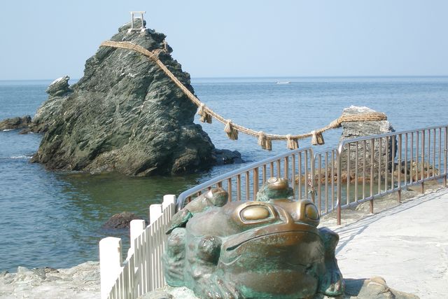 About a 10-minute walk from Ise Sea Paradise Aquarium, you'll find Meotoiwa (Meet-and-greet Rocks) and Futami Okitama Shrine. As the name suggests, Meotoiwa are two rocks connected by a thick rope, symbolizing the bond and harmony between a married couple. On clear days, the beautiful scenery of the sun rising between the rocks, the sea, and even Mount Fuji in the distance makes it a famous sunrise spot. Futami Okitama Shrine, home to Meotoiwa, also features stone frog statues, making it a popular spot for visitors to pray for good fortune. After enjoying the interactive experience at the aquarium, why not take a stroll and make a wish?