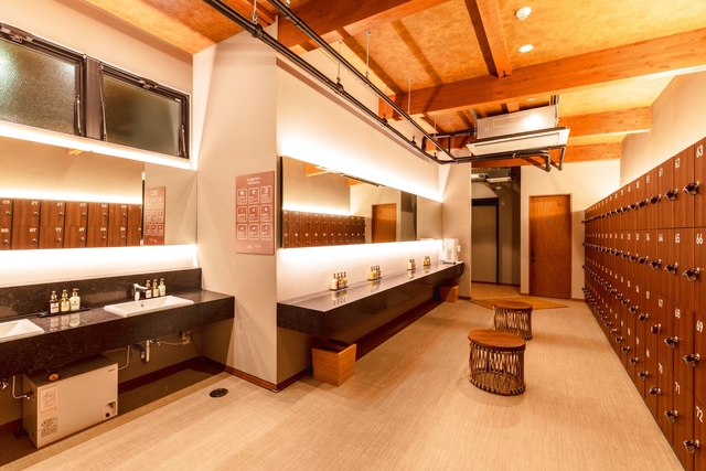 A spacious and clean changing area provides a comfortable place to change. A variety of amenities, including a hairdryer, skincare products, and hair care products, are also provided, making it ideal for a quick freshening up after a bath.