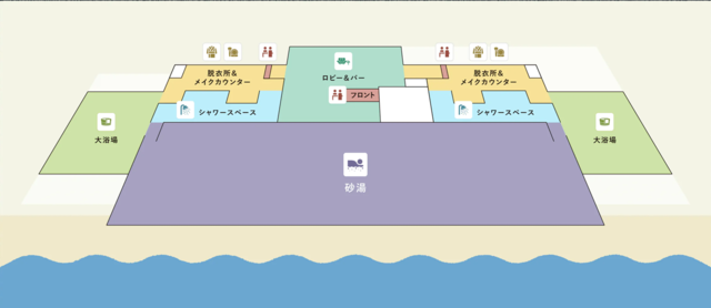 Located directly in front of Beppu Bay, this main area allows you to immerse yourself in the warm sand and feel the relaxing heat. The sand bath, which lasts approximately 15 minutes while listening to the sound of the waves, is effective in relieving fatigue and improving blood circulation. The sand is reheated at regular intervals daily and maintained in a hygienic condition, ensuring a clean and comfortable experience. After your sand bath, you can continue your experience by taking a shower or soaking in the large public bath.