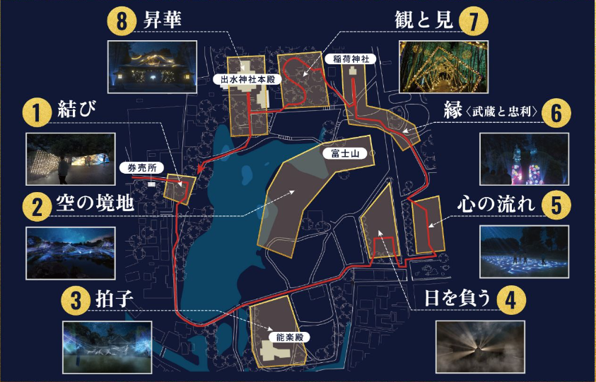 As the sun sets, Suizenji Garden opens its doors to eight paths of light. In the first section, a narrative symbolically weaving together Musashi's life begins.