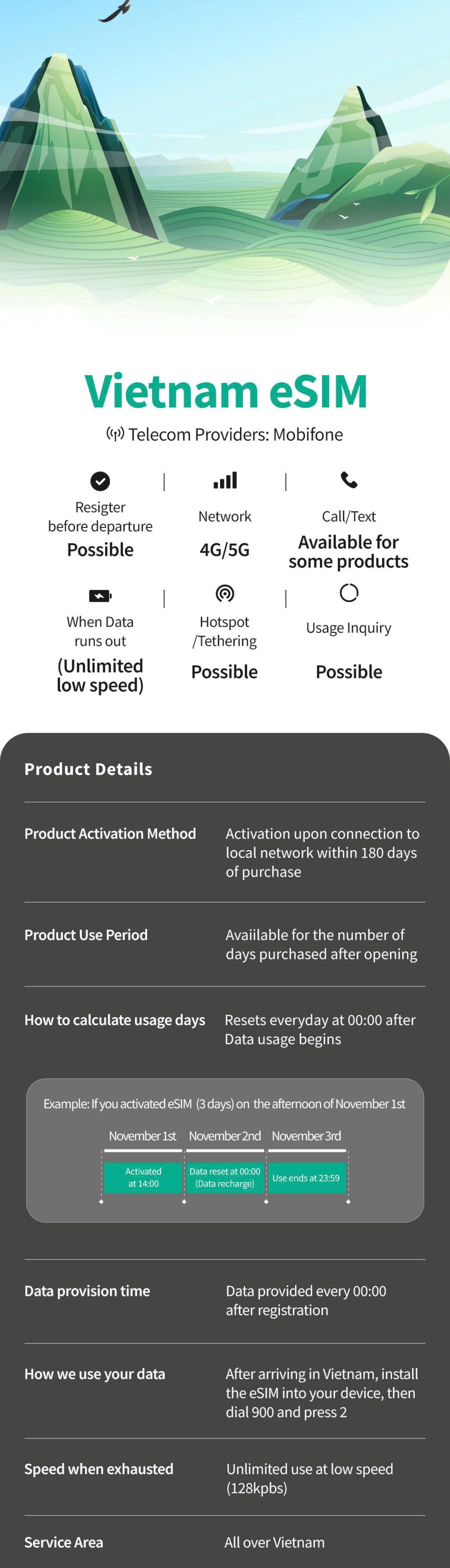 Get instant high-speed data connection as soon as you arrive in Vietnam! The eSIM is quick to install and use, ensuring stable internet access from the moment you begin your trip. It seamlessly supports a variety of popular apps, allowing you to seamlessly use maps, translation, and taxi-hailing apps, making it incredibly convenient to travel. Another major advantage is that it activates instantly with a QR code scan, eliminating the need to pick up a separate SIM card or swap out your old one. Enjoy a light and free trip to Vietnam with this eSIM, worry-free and worry-free!