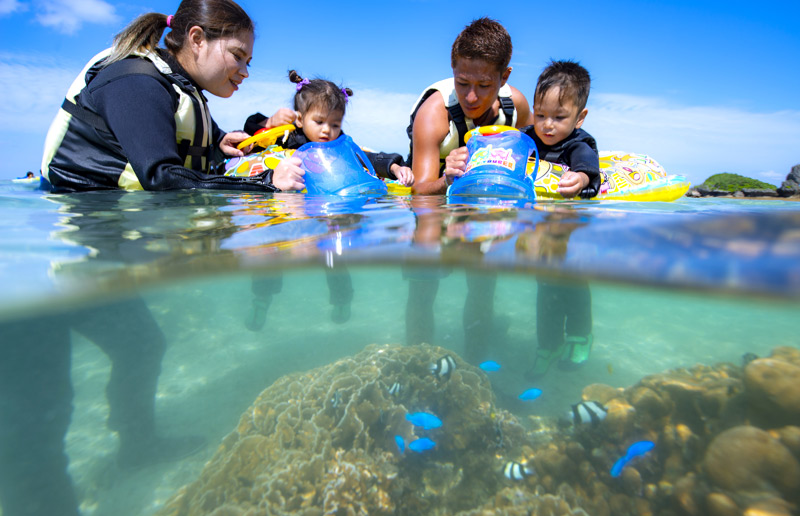 First, you'll float on the surface, learning breathing and posture. Once you're comfortable, you'll dip your head into the water and observe the underwater landscape of coral and fish. Younger children can ride tubes and view the ocean through underwater observation glasses, allowing everyone to enjoy the experience at their own pace.