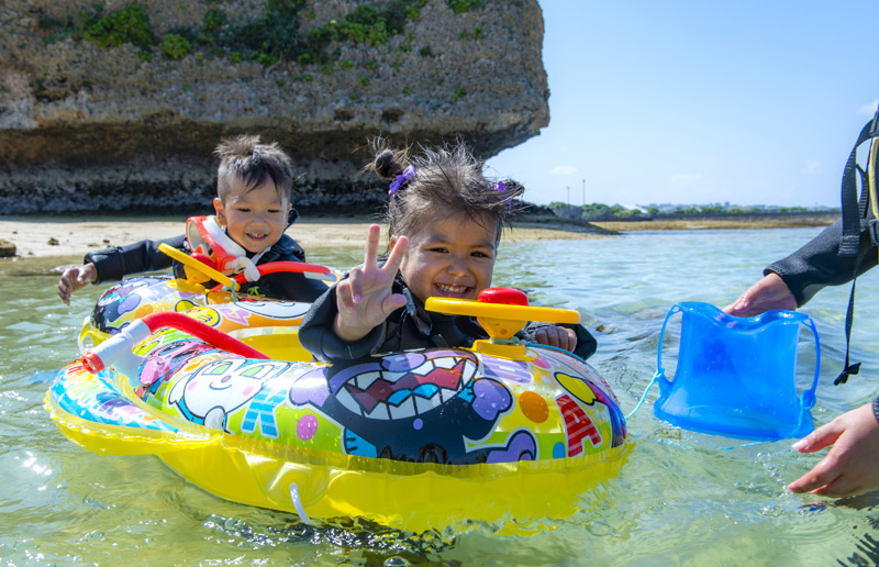 This is a sea picnic and snorkeling tour at Onna Village's natural beach. Starting in shallow waters suitable for children, even first-time snorkelers can easily adapt. After getting used to floating on the surface, the moment you dip your head into the water, the world of Okinawa's underwater world opens up before you. Younger children can ride tubes and peer into the ocean through underwater observation glasses, making it a perfect family trip. Feeding the fish brings a variety of fish closer, further enhancing the fun. The tour is organized in a shop with parking and shower facilities, making it convenient from start to finish. You'll also receive complimentary photo data from the tour, ensuring you can capture precious moments.