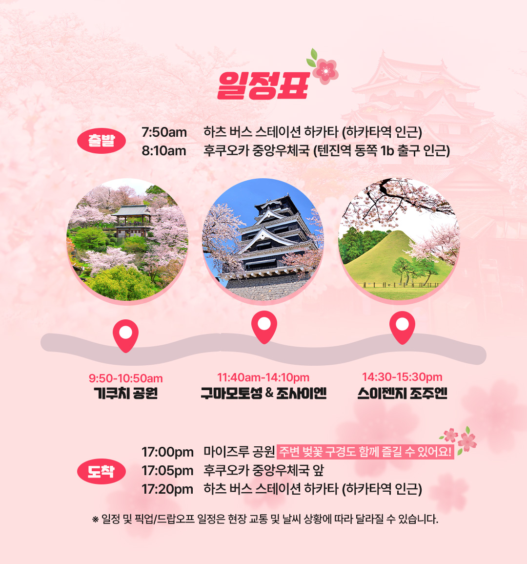This tour is convenient from the start because you can choose a pickup location from Hakata and Tenjin, and it's a course that efficiently captures Kumamoto's representative cherry blossom spots in one day. With a fluttering heart, after picking up at Tenjin Station, heading to Kumamoto, you'll first be greeted by the peak of spring at Kikuchi Park, where cherry blossoms unfold like waves. Walking through the pink tunnel created by about 3,000 cherry trees, you can naturally capture 인생 photos wherever you take them, and you can fully enjoy the picnic vibe under the cherry blossoms with street food that comes in season.