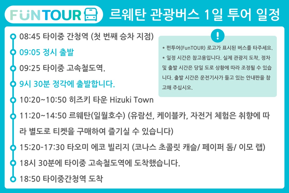Board at either Taichung Gancheng Station (departure at 09:05) or Taichung High-Speed Rail Station (departure at 09:30). A dedicated bus with the FunTOUR logo is waiting for you.