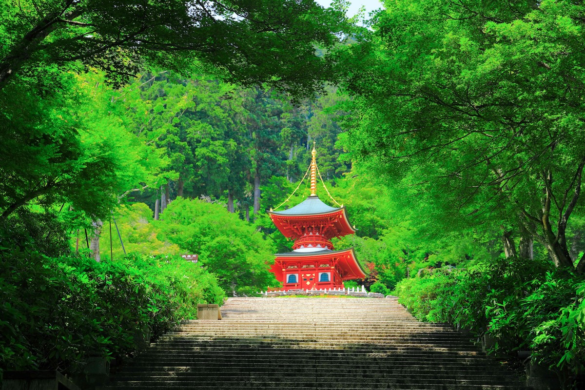 It's about 30 minutes from downtown Osaka, but you can find a completely different atmosphere as soon as you enter the grounds. The large temple grounds, located in the mountains of Meiji no Mori Minoo Quasi-National Park, are surrounded by lush nature, making it a great place to forget the hustle and bustle of the city and spend quiet time.