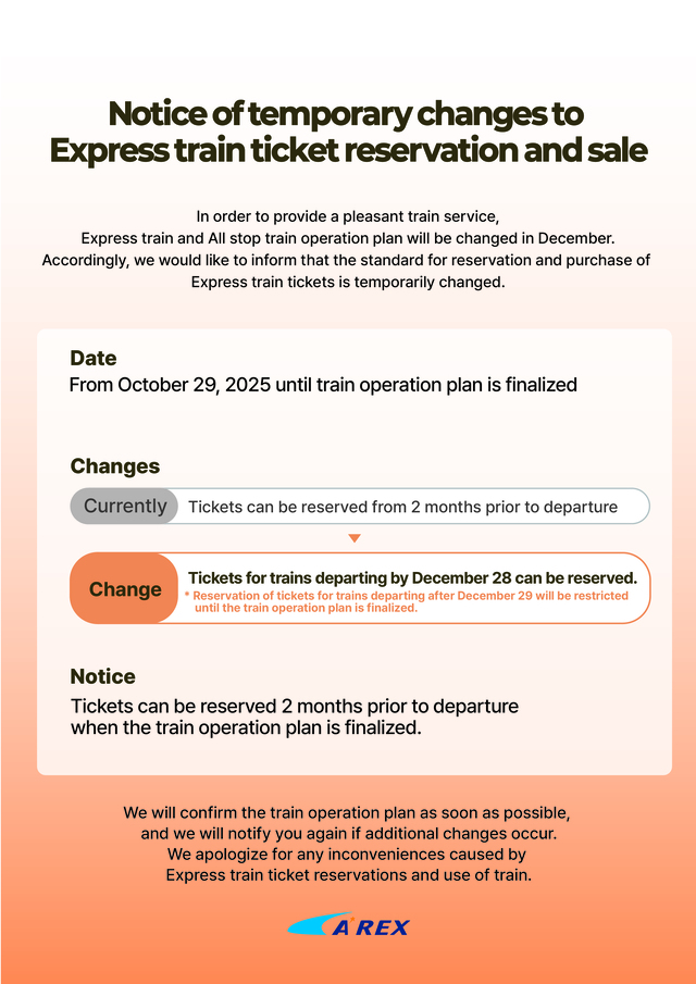 Korean🚫 The AREX train schedule will be changed starting from December 29, 2025. 🚫 Accordingly, ticket reservations for dates after December 29 will be temporarily unavailable until the new schedule is confirmed.