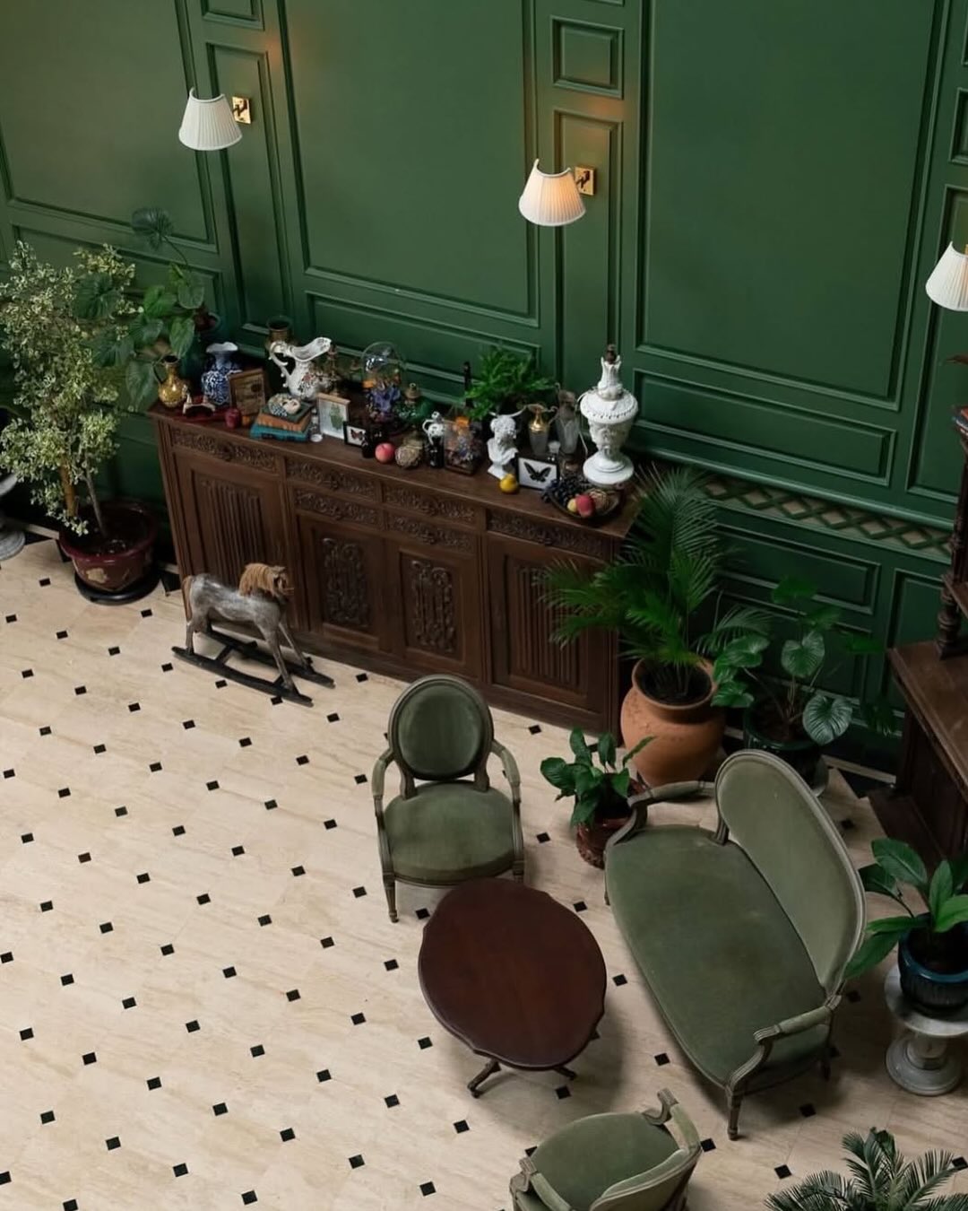 A bar featuring a calm emerald-toned atmosphere and classic library interior. It serves as a quiet reading space by day and transforms into a romantic spot with sweet live jazz and cocktails by night.