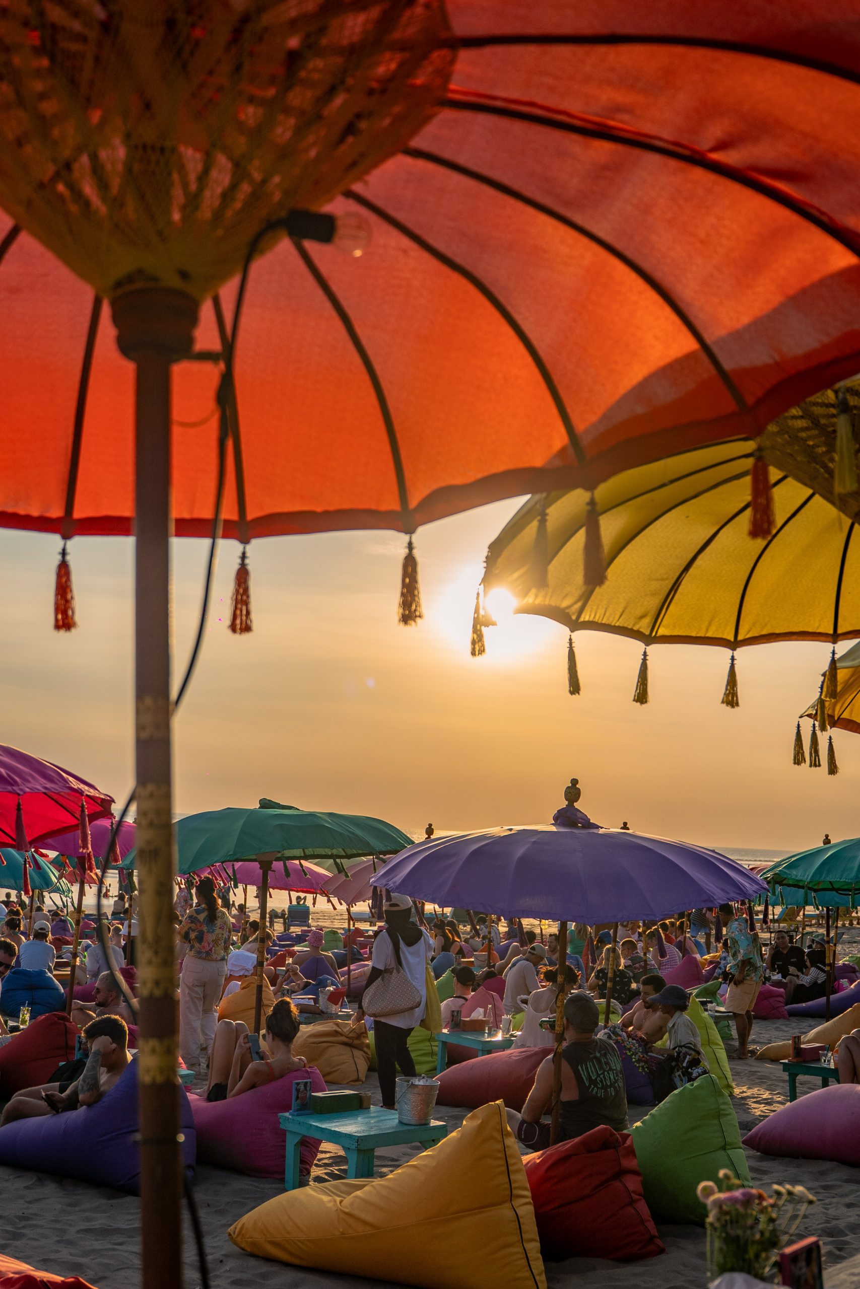 Located on Seminyak Beach, this iconic spot is famous for its rainbow-colored umbrellas and beanbags. Sitting on the sand, feeling the gentle breeze, and sipping a Bintang while listening to the waves is purely romantic. With no strict dress code, it’s the perfect, laid-back place to start your first night in Bali with affordable, ice-cold beer.