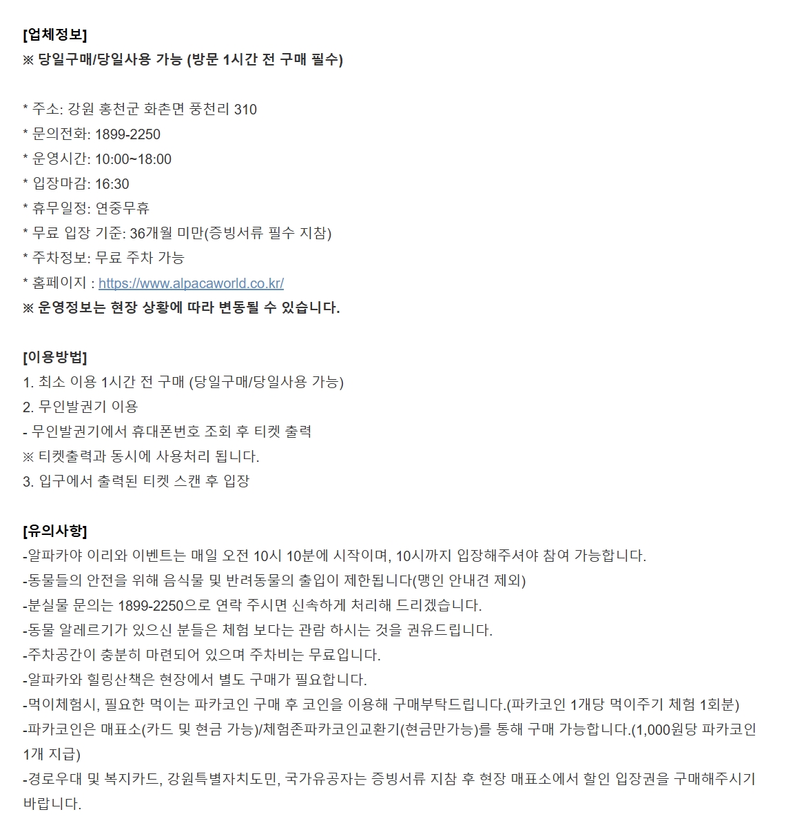세계 최초, 세계 유일의 알파카 테마파크! 외국인 대한민국 방문 호감도 1순위 여행지! 아이가 있다면 지나칠 수 없는 오픈 체험형(생태교육) 동물원! 여행사 선정 강원도 꼭 가봐야 할 특급 여행지! 아직도 알파카월드를 모르신다고요? 그럼 서두르셔야 합니다! 국내뿐 아니라 해외 그 어디서도 경험할 수 없는 다양한 퍼포먼스와 자유로이 활보하는 동물들을 만나실 수 있는 곳이 바로 알파카월드입니다.