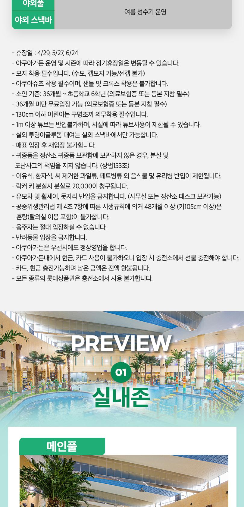 아쿠아가든은 온 가족이 즐길 수 있는 워터파크로 아이들이 좋아하는 어린이풀, 유아풀과 유수풀이 있는 넓은 메인풀이 있고 아이들의 모험심을 자극하는 징검다리와 물대포 등 다채로운 즐길거리와 어른들의 피로를 싹 풀어줄 바데풀이 있어요. 남녀노소 모두 즐길 수 있는 부여 아쿠아가든에 방문해 보세요!