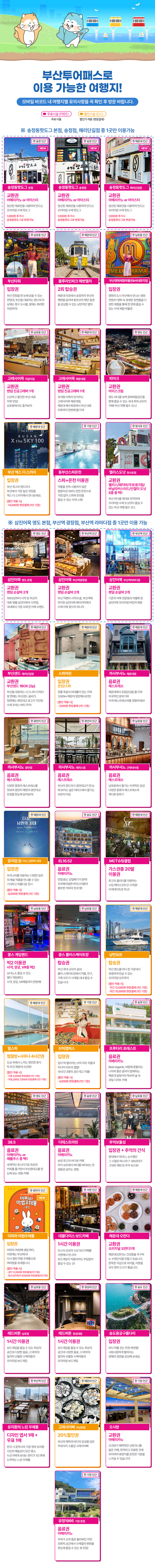 갈 곳은 많고 사야하는 입장권이 많을때! 부산 투어패스 프리패스권을 이용해보세요! 원하는 여행지나 코스에 맞춰 고를 수 있는 투어패스로 무료 입장 혜택이 정말 많아요.
