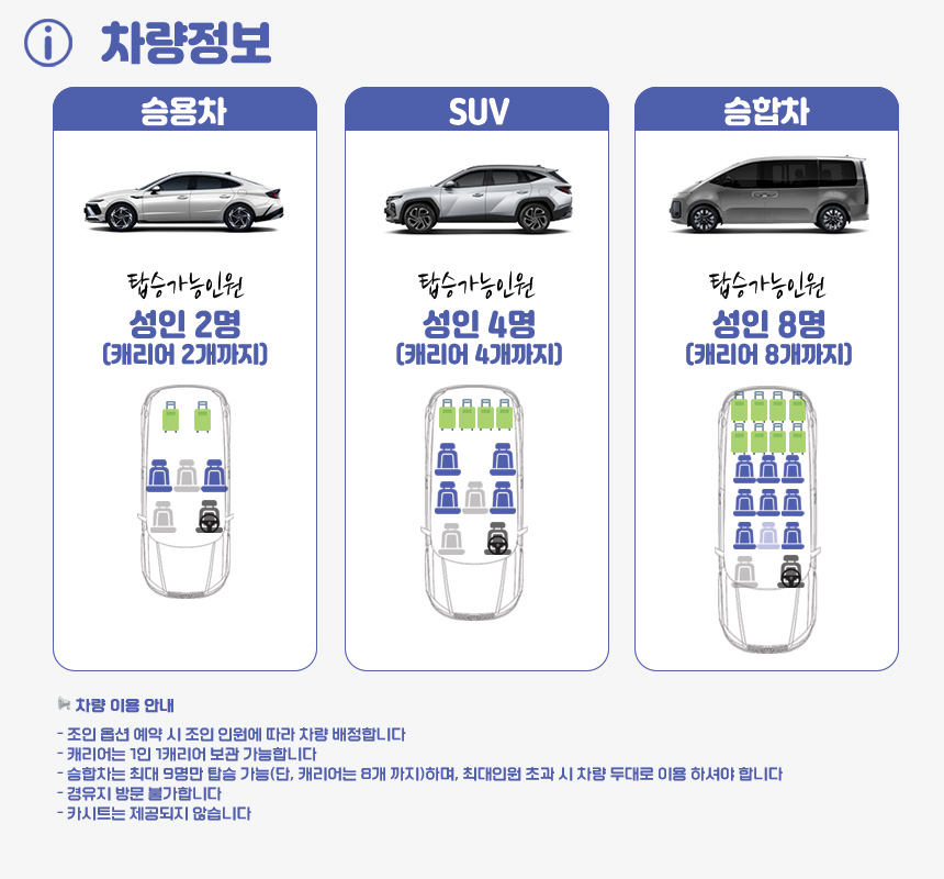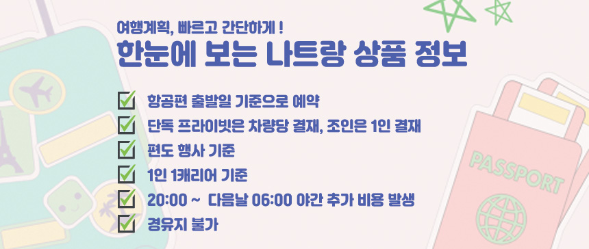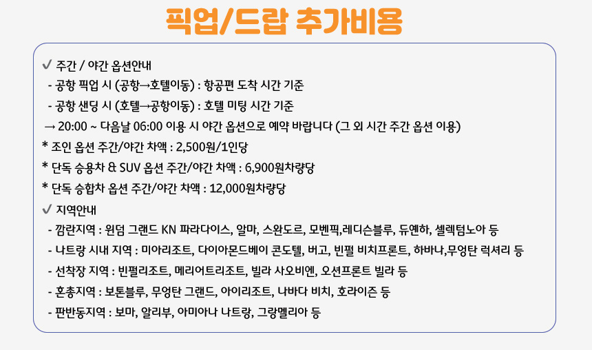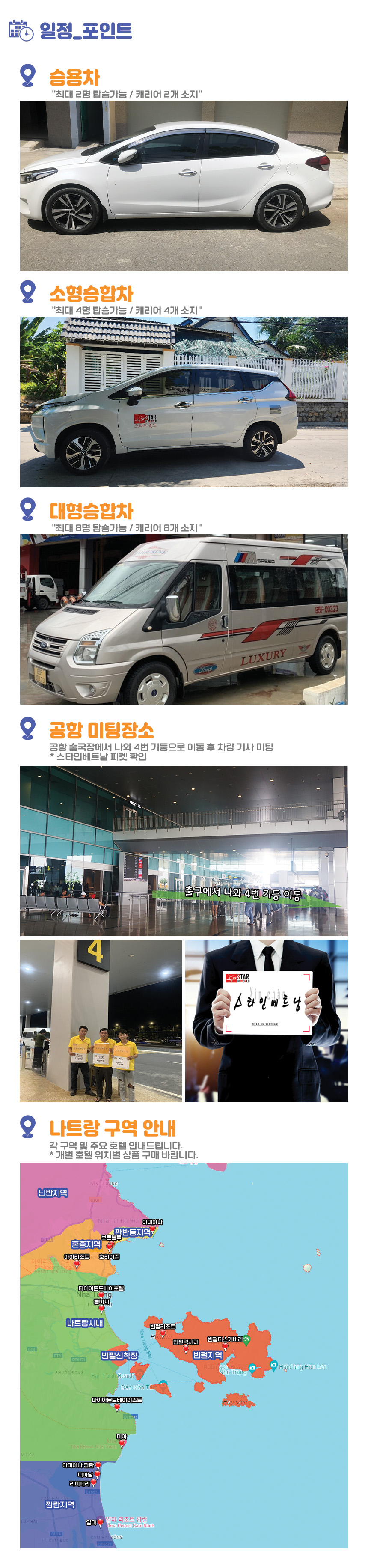 피곤한 비행 후에 지친 몸과 짐을 끌고 힘들고 이동할 필요 없이 일행끼리만 조용하고 안전하게 이동할 수 있는 단독 픽업 & 샌딩입니다. 공항버스를 타자니 머리가 아프고 택시를 타자니 흥정에 항상 실패해 바가지를 쓰셨던 경험이 있으시다면 꼭 이용해 보세요. 깜란 공항에서 나트랑 시내의 호텔(리조트)까지 또는 리조트에서 깜란 공항까지 단독 차량으로 안전하고 편하게 이동해 보세요. 여러분들의 이동을 아주 프라이빗하고 편하게 만들어드립니다.