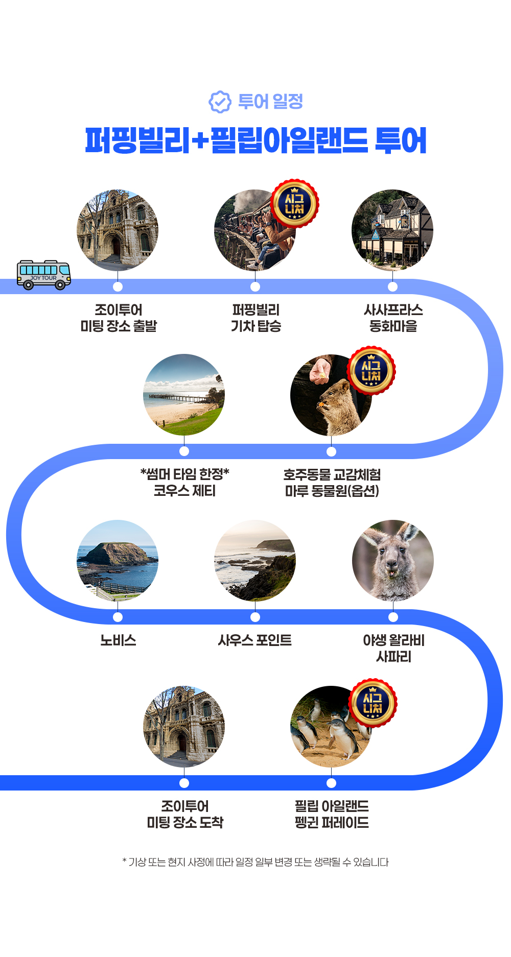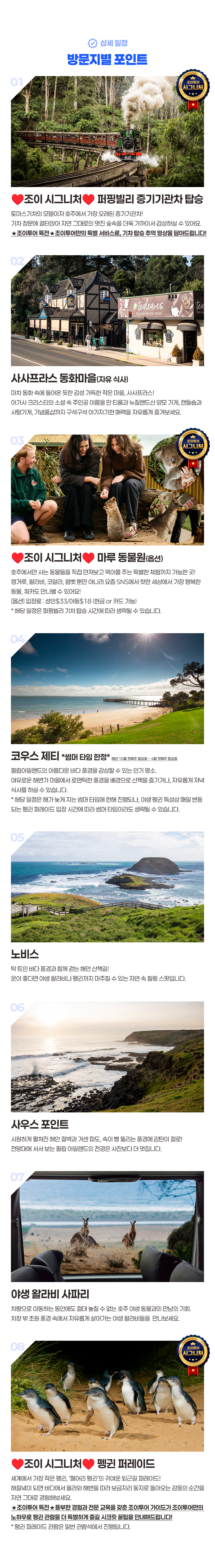 베스트조이투어 천국가이드님과 함께한 하루 너무너무 유쾌하고 유익하고 알찼습니다 제일 중요한건 많은 배경지식을 듣기편안한 목소리로 딕션이 귀에 꽂히게 잘 설명해주셔서 너무 좋았습니다 퍼핑빌리에서 신나게 기차를 타고 점심먹는 프랑스인마을(사사프리?) 에서 우아하게 티한잔 마루동물원에서 재밌는 시간을 보냈습니다 너무너무 신기한건 큰 대형버스를 나이스하게 운전하며 출발할때부터 각 코스전에 나근나근한 목소리로 잘 설명해주시는게 좋았습니다 설명하시다 중간 휴식시간도 분배가 너무너무 좋았습니다 그리고 압권은 필립아일랜드 섬 들어서부터 야생 왈라비와 펭귀도 보고 멋진 석양에 사진도 찍어주시고 펭귄 퍼레이드할때 꿀팁도 알려주셔서 너무너무 신나게 펭귄 관찰을 하고 왔습니다 가족들이 너무너무 좋아해서 뿌듯합니다 조이투어 박천국 가이드님 묻지도따지지도 말고 강추합니다!!! !!