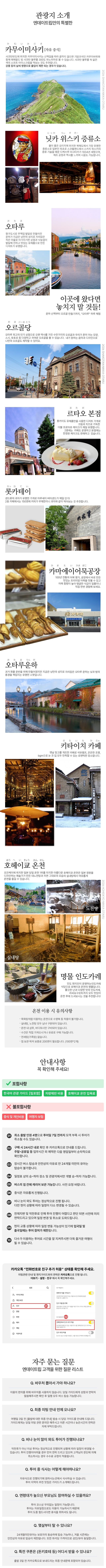 하루 안에 이곳저곳 다 방문하고 싶지만, 교통편이 어려운 분! 최대 8인까지만 탑승하는 전용차량을 타고 편하게 핵심 장소만 방문하고 싶은 분을 위해 요즘 뜨고 있는 엔데이 트립 오타루, 닛카 투어! 계절별로 당일 온천으로 인기 있는 호헤이쿄 노천 또는 샤코탄 블루 조망하는 카무이미사키를 방문하며, 물이 좋기로 유명한 닛카 위스키 증류소에 방문해 다양한 위스키에 대해 알아보는 시간을 가져볼 수 있어요. 마지막으로 가장 기다리던 오타루 운하의 야경을 감상하러 이동해 가스등에서 뿜어져 나오는 불빛은 감상해 보세요. 마치 유럽을 연상시키며 로맨틱한 분위기를 느낄 수 있어요.