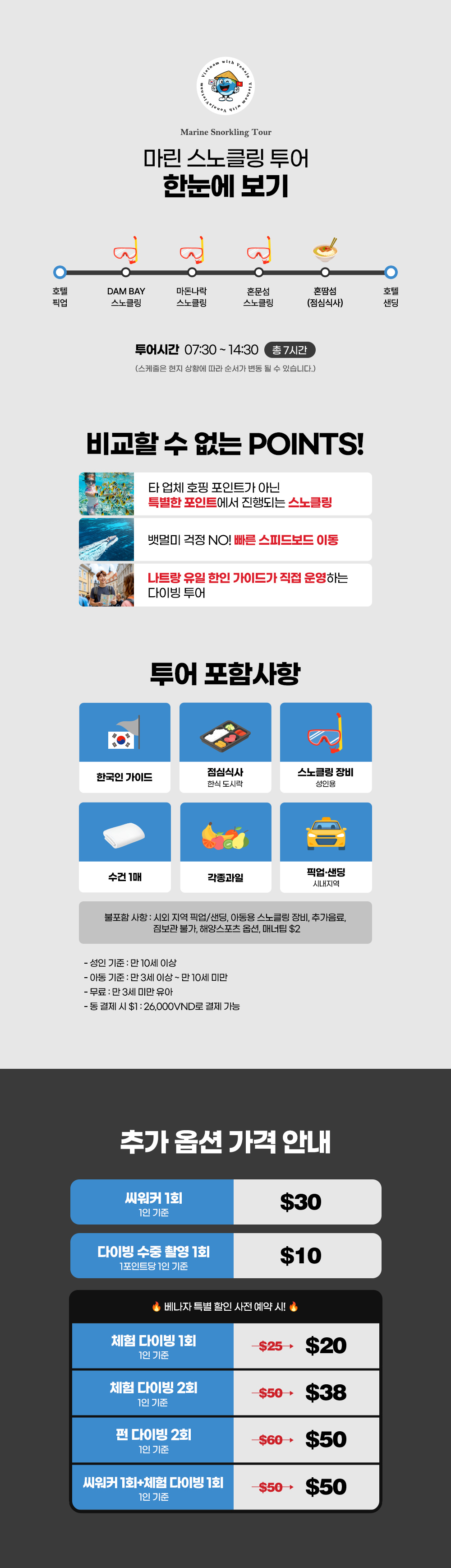 베트남 최대 자유 여행사, '베나자'에서 진행하는 '펀다이빙 호핑 투어'에는 한국인 가이드, 전원 다이버 자격증인 PADI Divemaster를 취득한 현지인 가이드 & 한국인 강사가 동행해, 스노클링을 더욱 안전하고 재밌게 즐길 수 있어요.