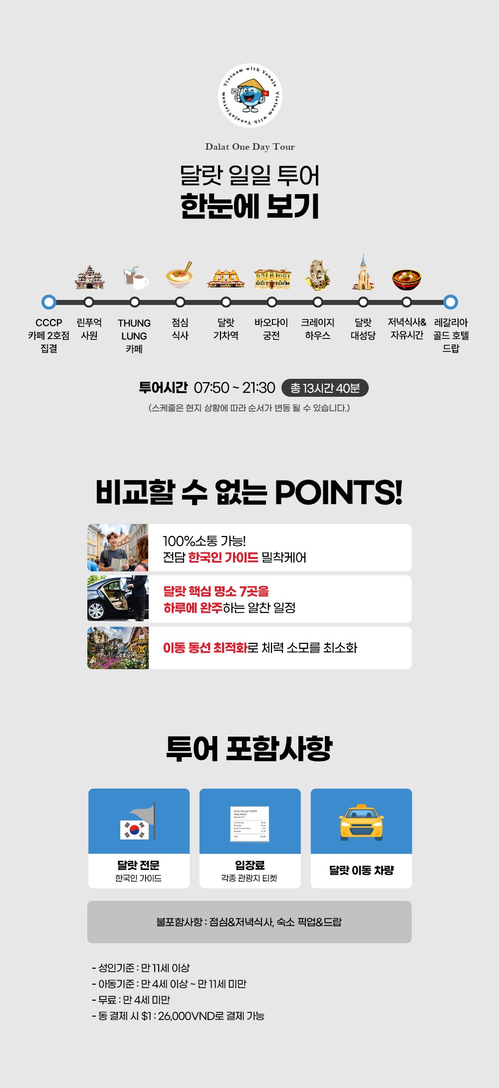 베스트정말최고였습니다!!! 날씨요정들만 모여서 우기에 최고의 날씨 컨디션을 보여줬구요!! 강하늘가이드님이 엄청 꼼꼼히 설명해 주셔서 재미가 두배가 되었어요!!! 장시간 차에서 시간 보내시고 가이드 하시기도 힘들텐데 (유일하게 아이가 있는 저희집을) 많이 신경써주셔서 정말 감사했어요 짬날때마다 사진도 찍어주시구요!! 멀미약도 미리 챙겨주시는 센스!! 깨끗한 화장실 맛집 정보등도 알려쥬셔서 여행에 큰 도움이되었어요!! 아름다웠던 달랏 최고였습니다~~ 단점은 긴 자동차 탑승시간(3시간) 길이 구불구불한 구간이 많아 (대관령 옛길 느낌)그게 좀 힘들다면 힘들었습니다ㅎㅎ 그래도 너무 재밌었습니다~~~