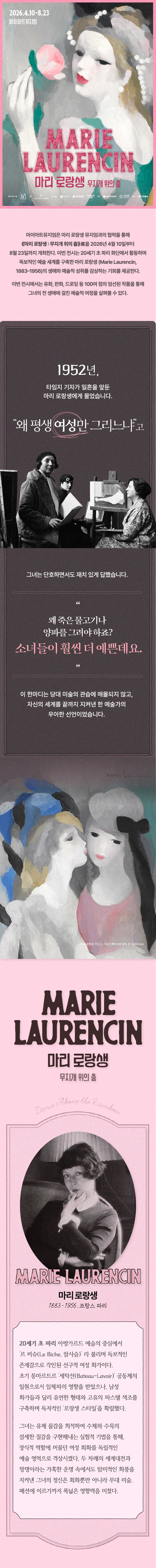 부드러운 색채와 몽환적인 분위기로 사랑받는 화가 마리 로랑생의 작품 세계를 한자리에서 만나보세요. ‘마리 로랑생 : 무지개 위의 춤’ 전시는 그녀가 평생에 걸쳐 그려온 여성, 감정, 관계의 이야기를 중심으로 그녀만의 섬세한 예술 세계를 조명하는 특별한 전시예요.