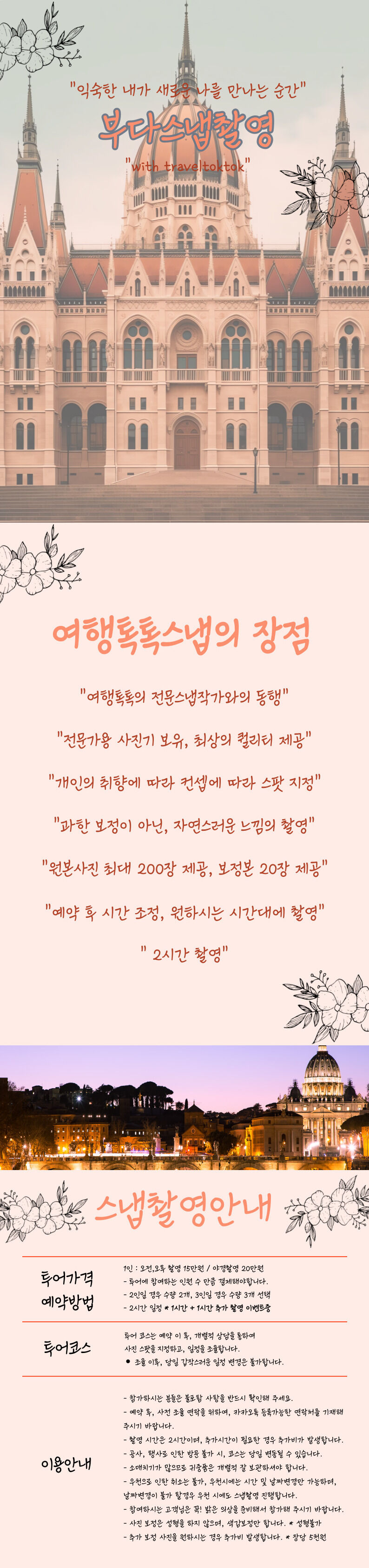 전문 스냅 작가가 찍어주는 유럽 여행의 최고의 인생샷을 갖고 싶으시다면 지금 부다스냅촬영을 이용해 보세요. 전문가용 사진기를 보유하여 최상의 퀄리티를 제공하고 상담을 통해 개인의 취향에 따라 컨셉에 맞게 스팟을 지정하고 사진을 찍어드리는 것이 가장 큰 장점이에요. 과한 보정이 아닌 사랑하는 사람과 또는 친구와 자연스러운 모습을 담아드리려고 노력하고 있으니, 여행 중에 나에게 주는 최고의 선물이 될 수 있어요. 예약후 기재하신 연락처로 투어사에서 연락을 드리고 있어요. 전문 스냅 작가와 함께하는 의미있는 시간 보내 보세요.