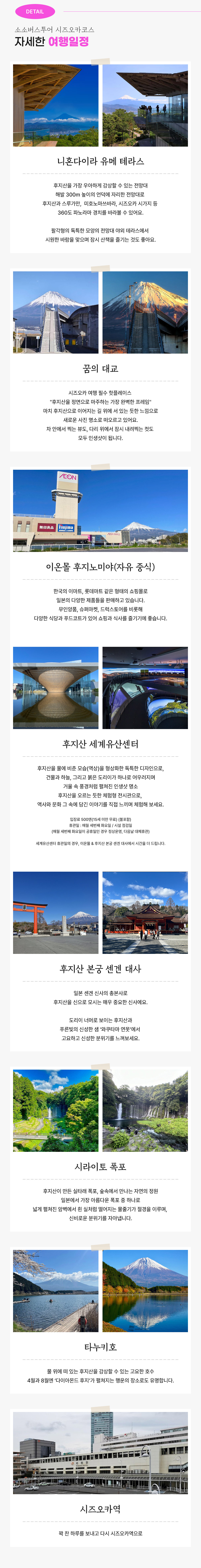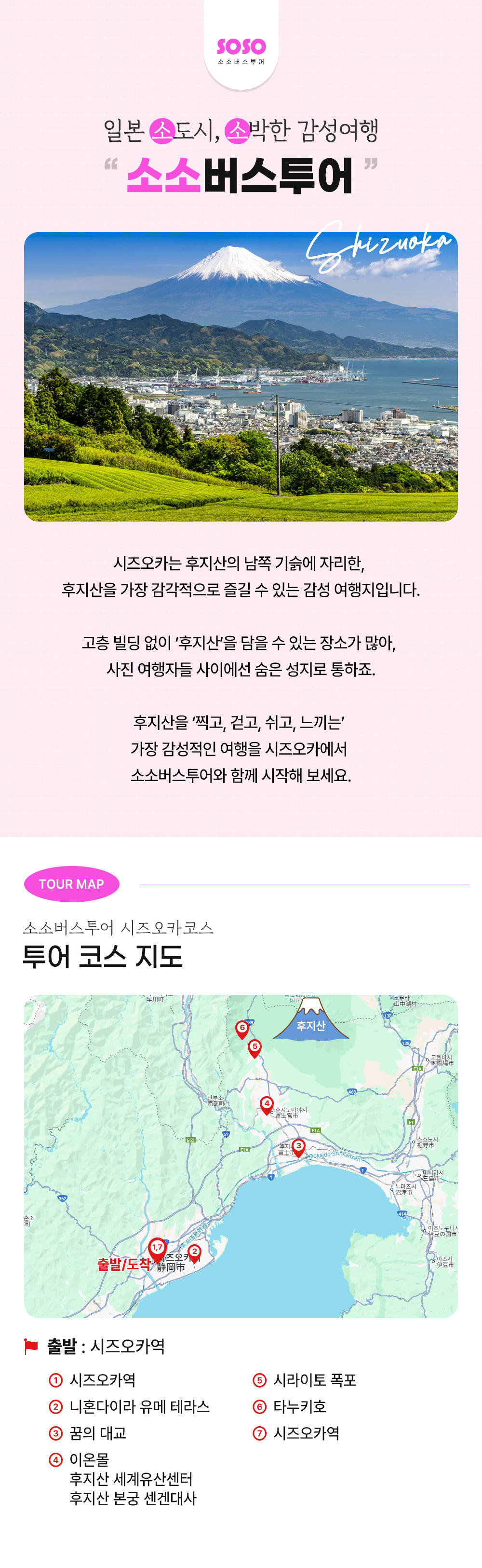후지산을 ‘찍고, 걷고, 쉬고, 느끼는’ 가장 감성적인 여행을 원한다면 소소버스투어와 함께 떠나보세요! 시즈오카에는 고층 빌딩 없이 후지산을 담을 수 있는 명소가 많아 사진 찍기 좋아하는 분들이라면 꼭 방문해야 할 여행지예요. 시즈오카역에서 출발해 후지산이 가장 잘 보이는 스팟들로만 골라 떠나는 일일 투어로 후지산을 만끽해 보세요!