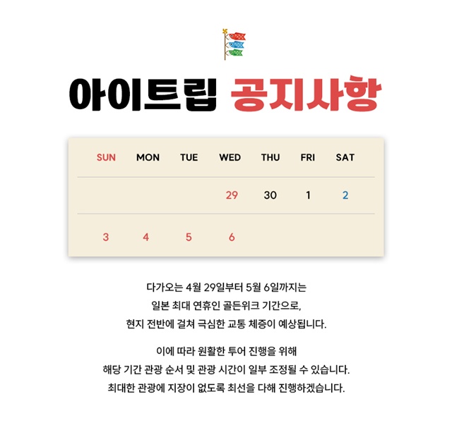 * 미팅 포인트에서 담당 가이드가 아이트립 깃발을 들고 있을 예정입니다.