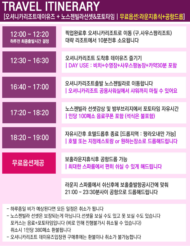 보홀에서 하루를 보내면서 휴식과 활동을 동시에 즐기고 싶다면 이 상품이 딱이에요! 호텔 픽업부터 드랍 서비스까지 포함되어 있어서 이동 걱정 없이 바로 여행을 시작할 수 있어요. 오셔니카 리조트에서는 탁 트인 바다와 수영장에서 여유롭게 휴식을 즐기다가, 카약 타기와 해변 산책 등 활동적인 시간으로 하루를 채울 수 있어요. 바다 위에서 느끼는 시원한 바람과 파도는 일상에서는 느낄 수 없는 상쾌한 즐거움을 줘요. 해질 무렵에는 노스젠 빌라로 이동해 밤부 브릿지를 걷고 선셋을 감상하며 하루를 마무리해요. 붉게 물드는 하늘과 잔잔한 바다를 바라보며 걷는 동안, 활동과 휴식이 완벽하게 어우러진 특별한 순간을 경험할 수 있어요.