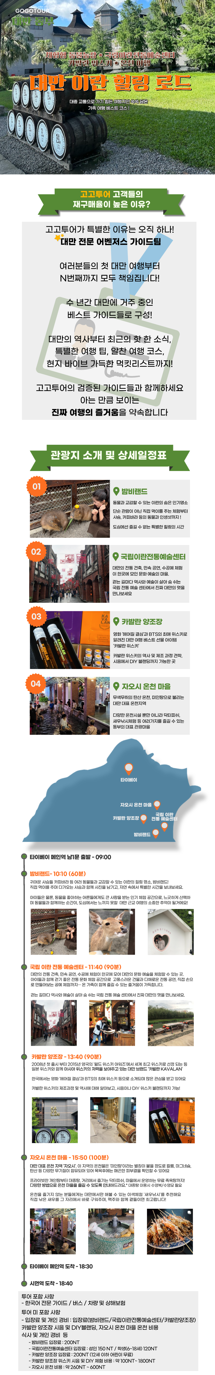 대만 위스키의 자존심으로 불리는 카발란 위스키 증류소와 유황 냄새가 없는 맑고 투명한 나트륨 탄산수소염 온천으로 유명한 자오시 온천을 하루에 함께 만나는 일정이에요.