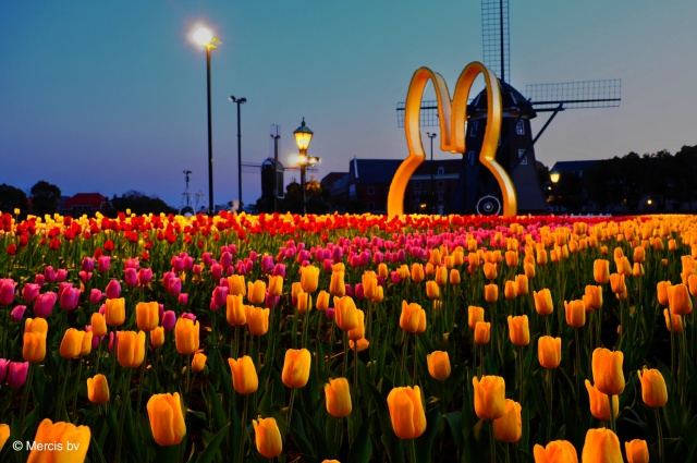風車とチューリップが調和したフォトスポットが登場!青い空とヨーロッパ風の街並みを背景に、春にしか出会えない特別な一枚を撮影しましょう。