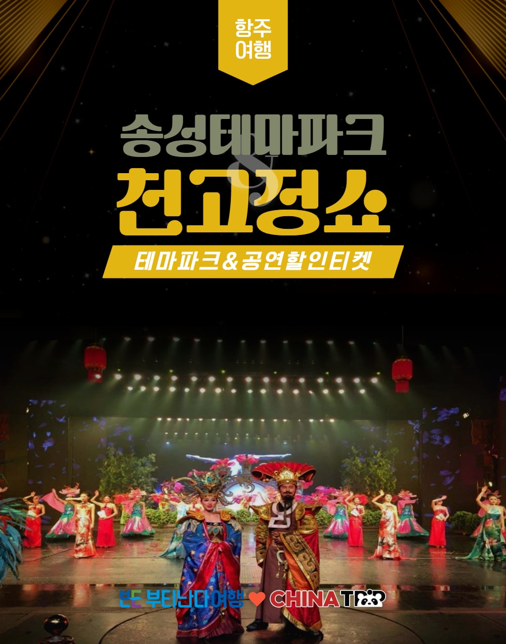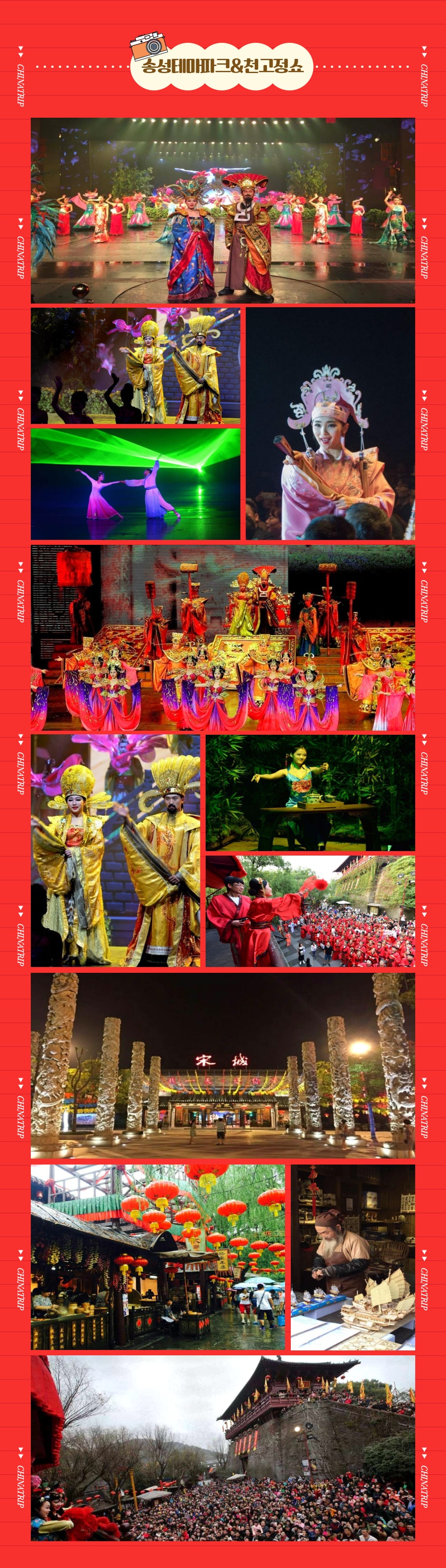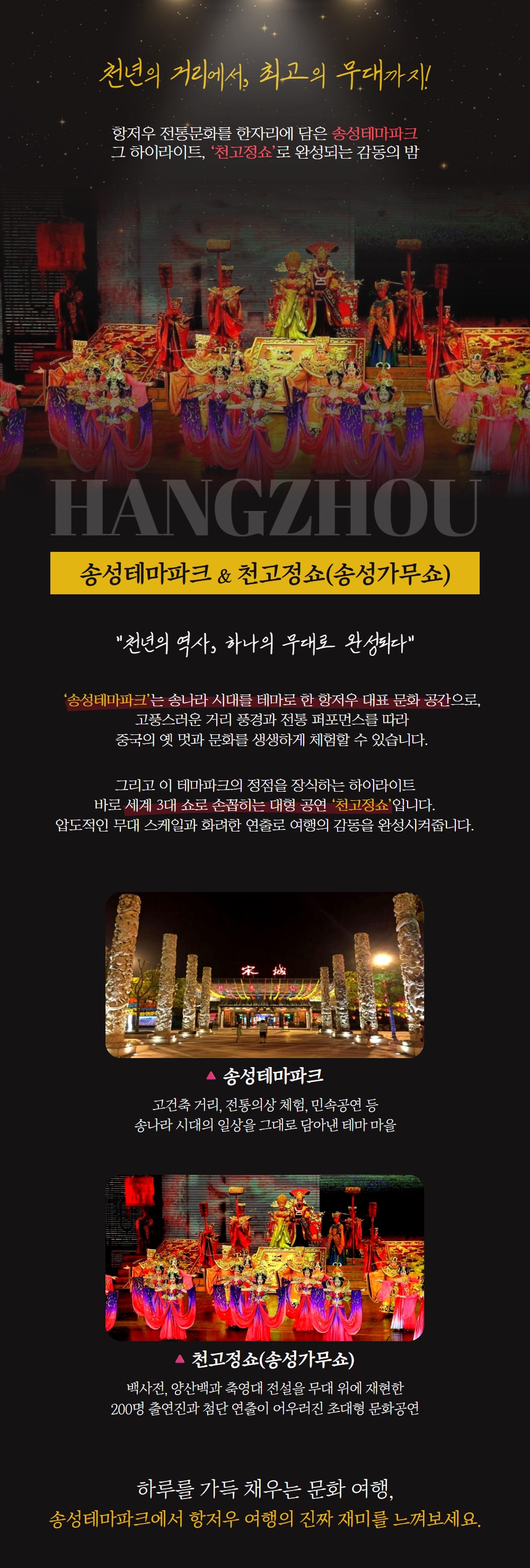 ラスベガスのOショー、パリのムーラン·ルージュと共に世界3大ショーの一つである杭州松城歌舞ショーをご覧ください。 特に、ソンソン歌舞ショーは壮大なスケールの公演で、皆さんも知らないうちに公演に夢中になるでしょう。 華やかな音楽と舞台装置が4つのコンセプトに合わせて舞台が時々刻々と変わるだけでなく、ストーリーも変わっているので、さらに興味深いのはもちろん!千年が過ぎた今日、再び蘇った宋の国のストーリーがメインで1時間が短く感じられるでしょう。