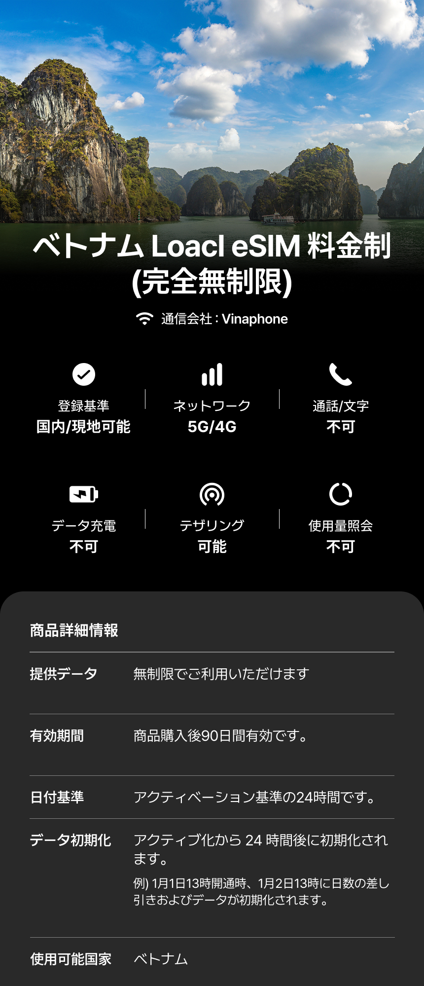 海外旅行中に必要不可欠なデータ! ベトナム旅行を快適に始めたいなら、ローカル網ベトナムデータ完全無制限eSIMをおすすめします。 eSIMの有効期限もメール送信日から30日以内に使えるので、自分が希望する日に便利に利用可能で速いデータを提供するという点がローカルeSIMならではの魅力ポイント!