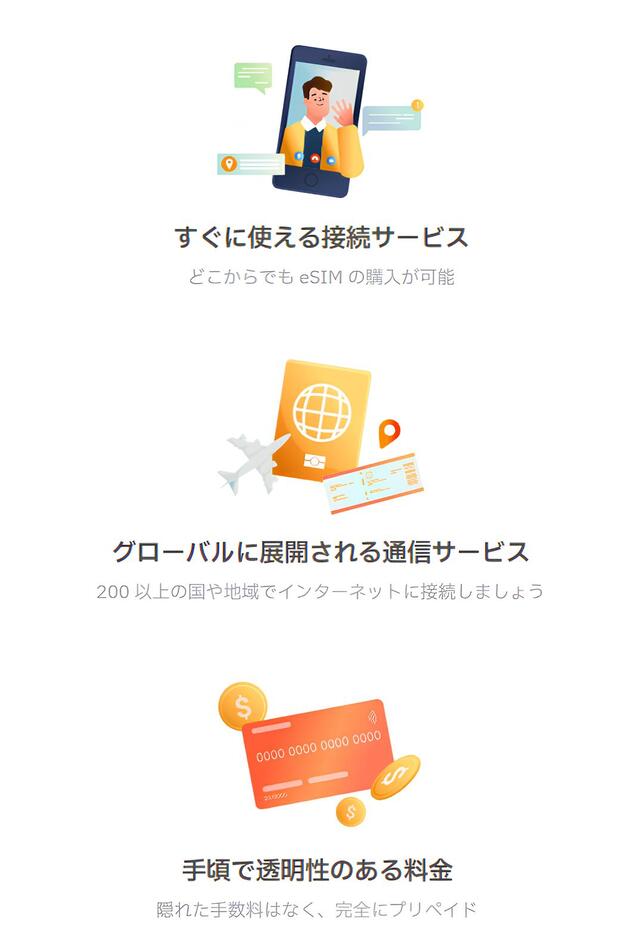 世界中の200以上の国でeSIMで簡単に接続できます 旅行先でも、出張中でも早く簡単にeSIMを購入してすぐに接続できます。 SIMカードを交換する必要がなく、簡単に活性化することができ、データの心配なく自由にインターネットを利用できます。 また、世界中の200以上の国や地域で安定したネットワークを提供し、どこでも途切れることなく接続できます。 すべての料金プランは、隠れた手数料なしで透明で合理的な前払い方式で提供されます。 必要に応じた料金プランをお選びいただき、お気軽にご利用ください!