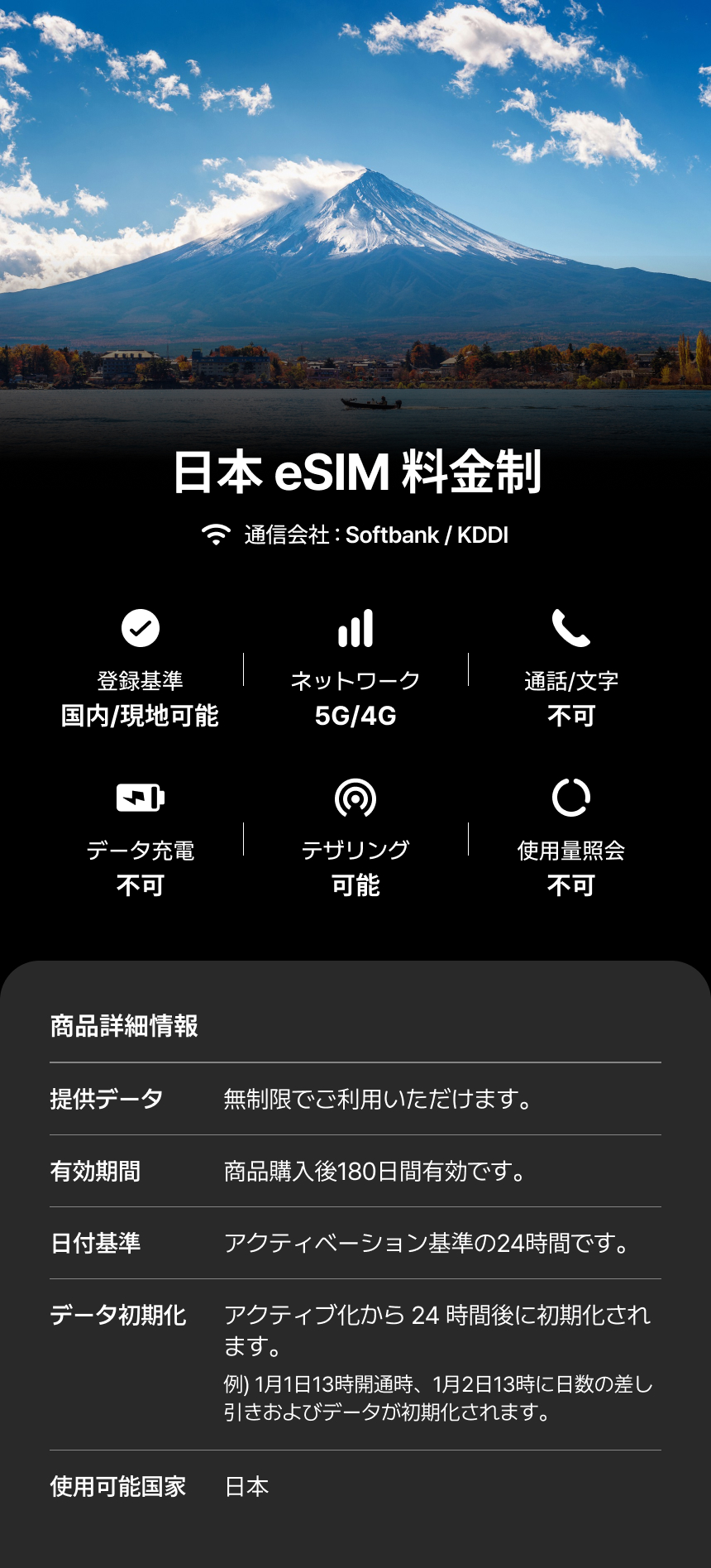 - eSIM商品は、最初に登録された端末でのみ登録および使用が可能です。