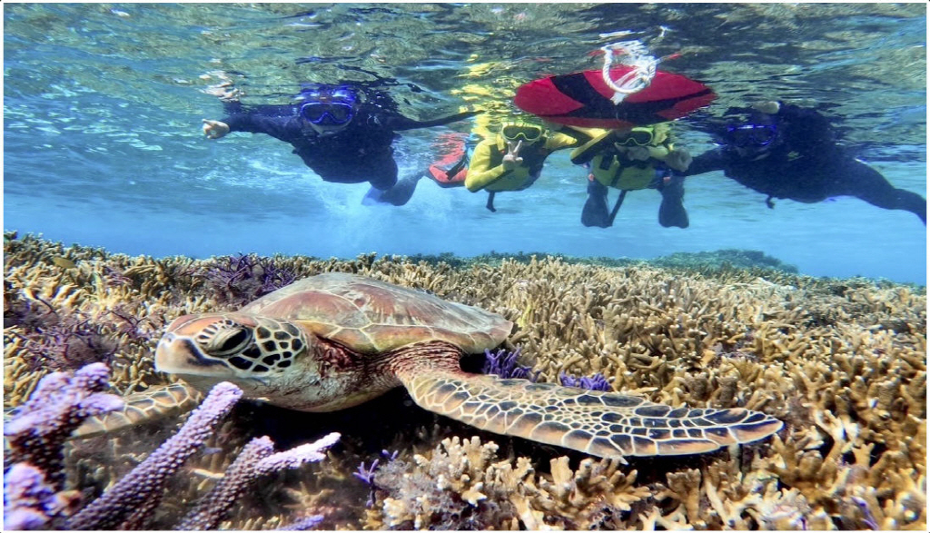 ウミガメを探して一緒に遊泳しながらシュノーケリング体験を実施