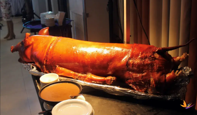 フィリピン式バーベキューのハイライト、豚の丸焼き