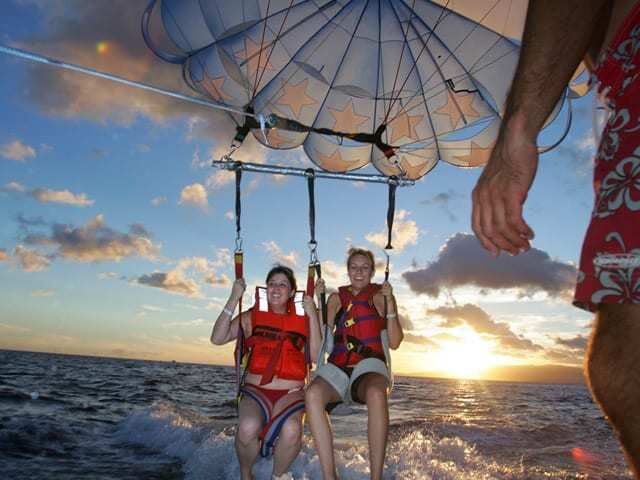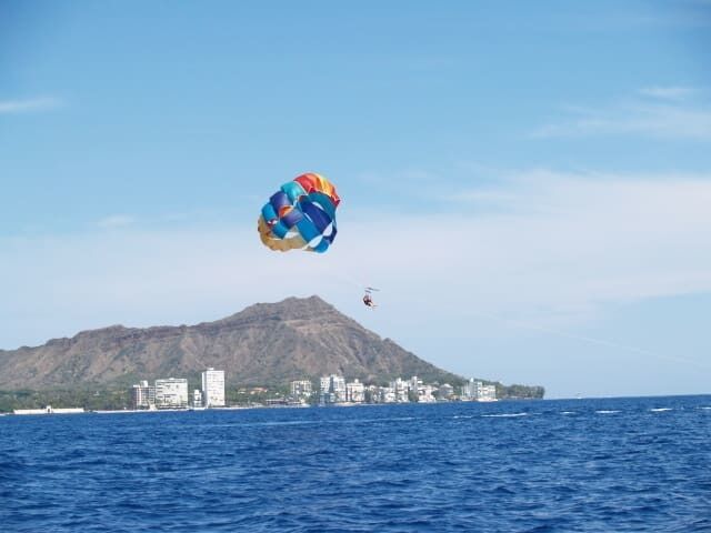 このツアーはワイキキ沖でボートに乗って移動した後、パラセーリングを楽しむ日程で行われます。