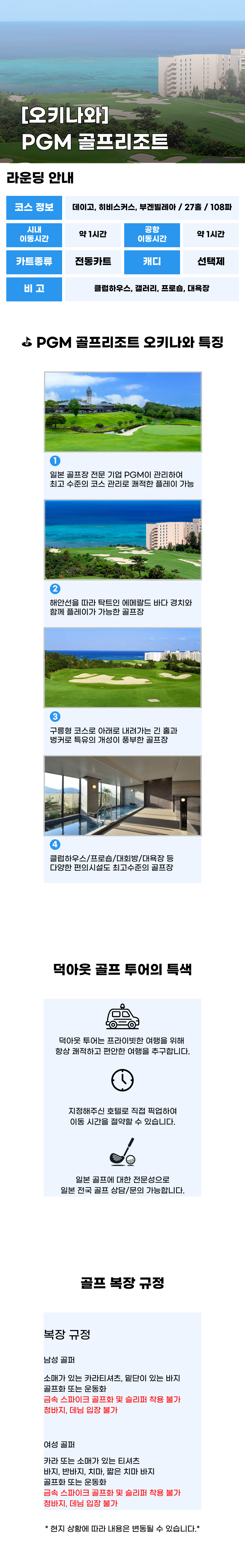 韓国語PGMゴルフリゾート沖縄は沖縄ならではの暖かい風に当たりながら、広々と開けたコースで涼しげにショットを飛ばすことができるリゾートゴルフ場です。 全体的にフェアウェイが豊かに設計されているので、初心者から中上級者まで気軽にラウンドを楽しむことができ、途中で戦略的に配置されたバンカーとハザードが適当な緊張感を作ってくれて攻略の楽しさも生きています。 ラウンド中ずっと南国の雰囲気が自然についてきて、きれいに整備されたコースコンディションのおかげでリズム感のあるプレーが続く感じです。 終わってからはクラブハウスでゆっくりとくつろいで次の日程に進むにもいいので、沖縄旅行の中にラウンドを一度入れたいという方にぴったりの場所です。