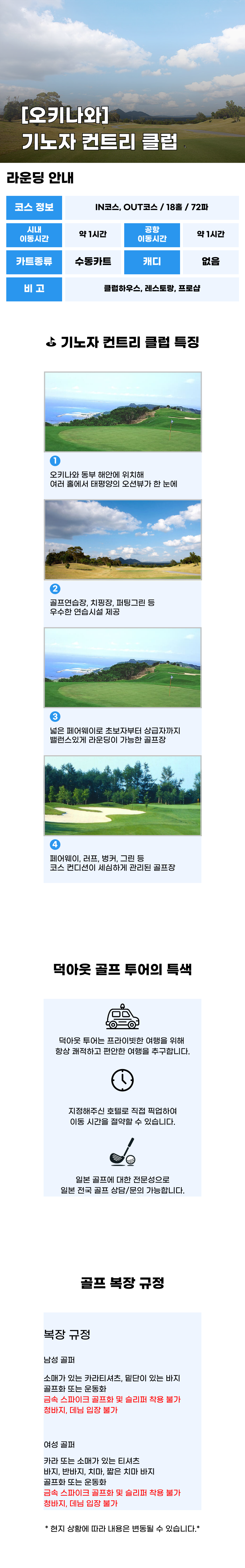 韓国語沖縄·宜野座カントリークラブは、北部宜野座地域の緑の森やゆるやかな丘陵地形の中に位置し、都心から離れたゆったりとした雰囲気の中でラウンドを楽しむことができる場所です。 自然の地形を生かしたコースなので、ホールごとに微妙に違うアップダウンと視野が広がって単調ではなく、フェアウェイ幅も適度にゆったりとした方なのでリズム感のあるプレーが続きます。 その代わり、セカンドショットからはグリーン周辺のバンカーや傾斜、ライン読みがそれとなくややこしい区間があって、一打一打攻略の面白さが生きています。 全体的にコース管理がすっきりしていて、コンディションの良い日にはショット感覚がよりよくつく感じがするし、ラウンド後はクラブハウスでゆっくり休みながら次の日程に移動するのにも良いので、沖縄旅行の日程にゴルフを自然に入れたいという方によく合うゴルフ場です。