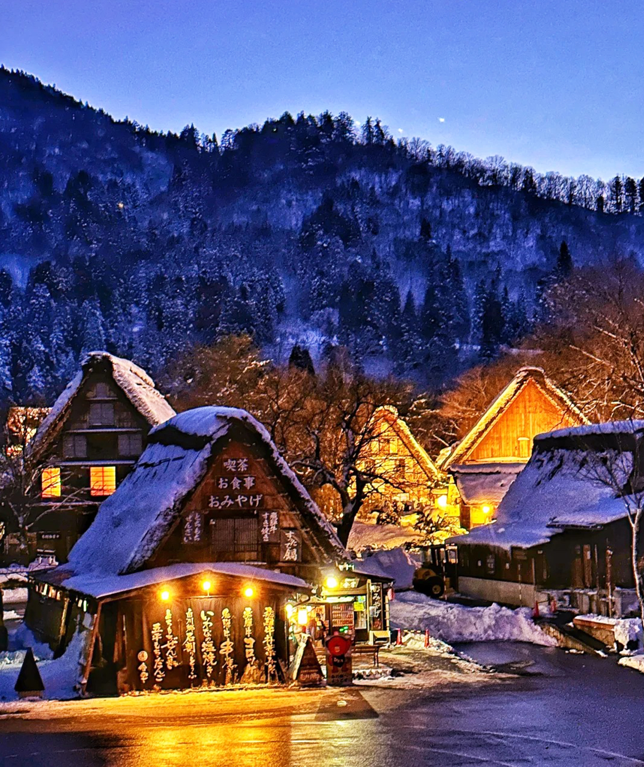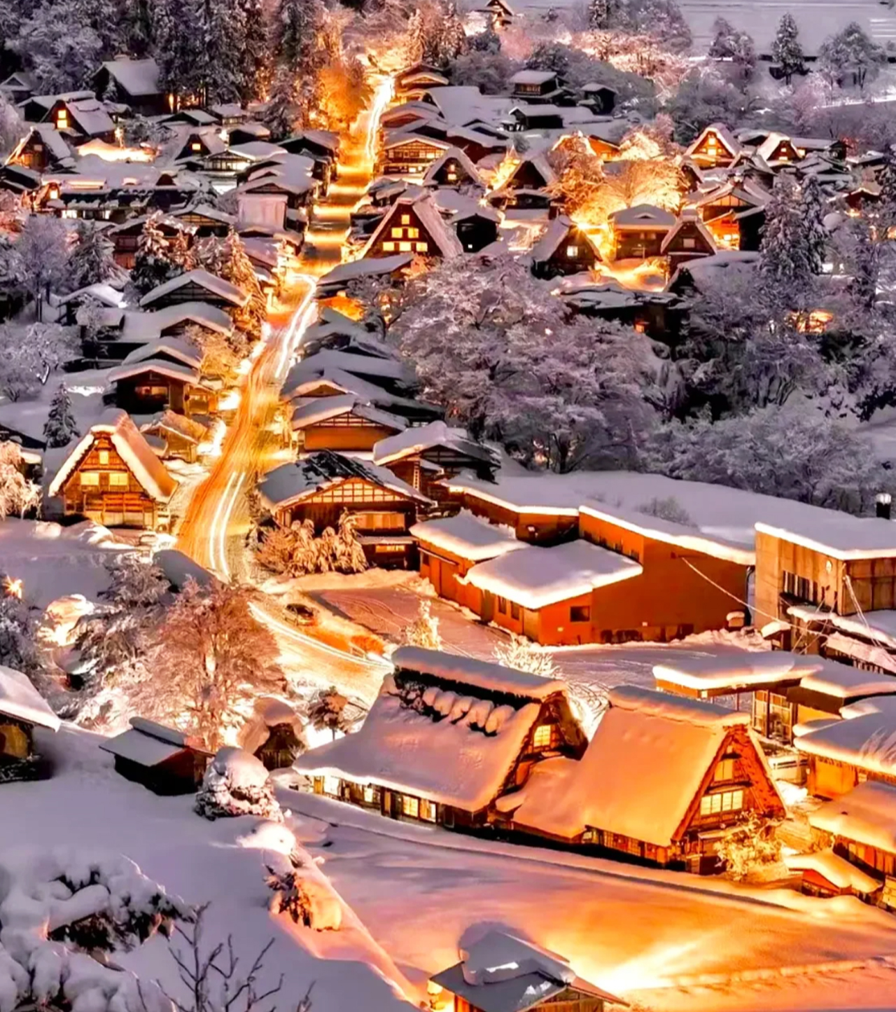 ✅雪に覆われた合掌村と照明が調和した幻想的な夜景