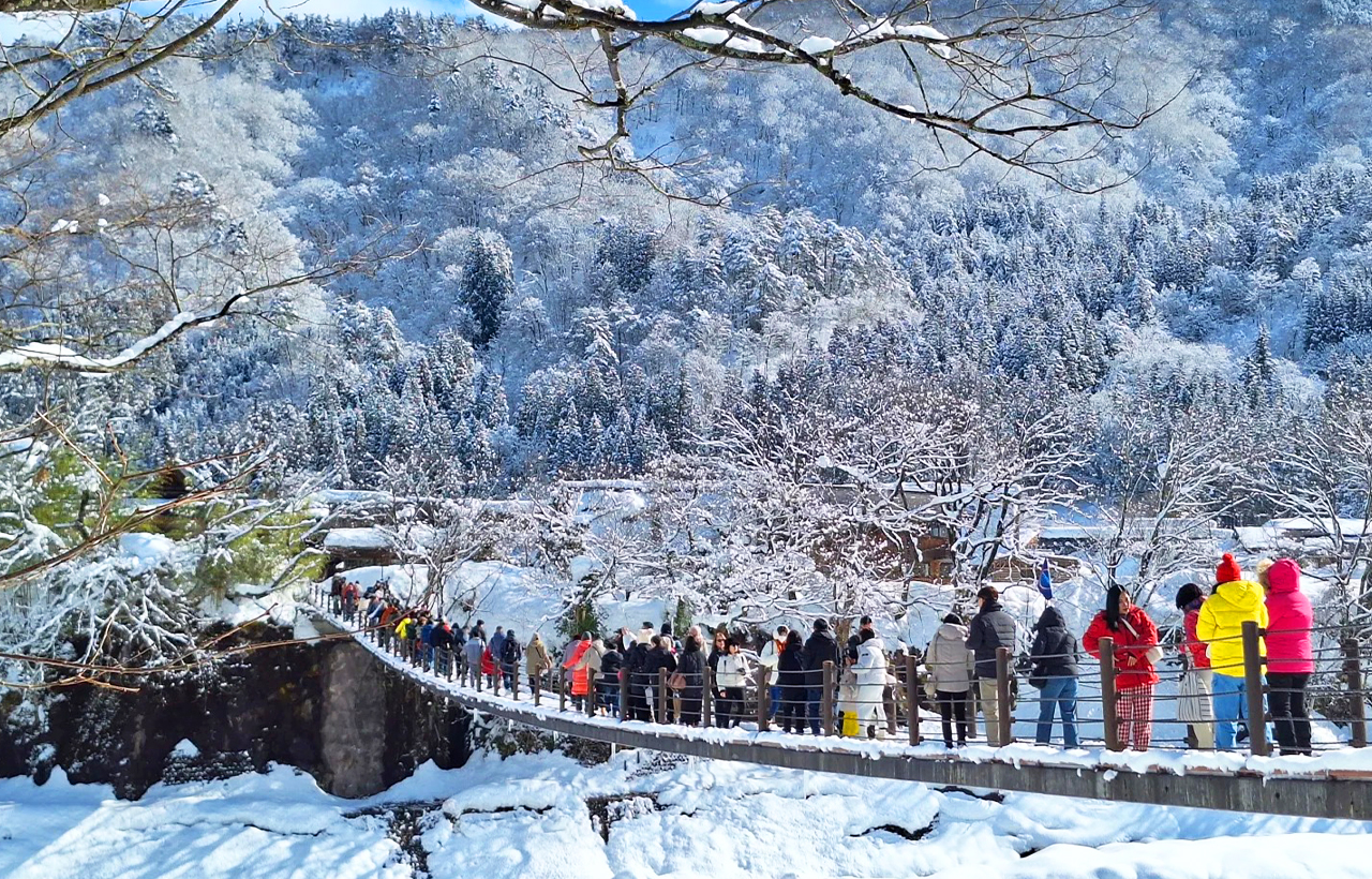 世界文化遺産に指定された白河合掌村で冬のシーズンのわずか4日間だけ行われるライトアップイベントを体験してみてください。 雪に覆われた合掌構造の伝統家屋と照明が調和し、普段は見られない幻想的な夜景が広がります。