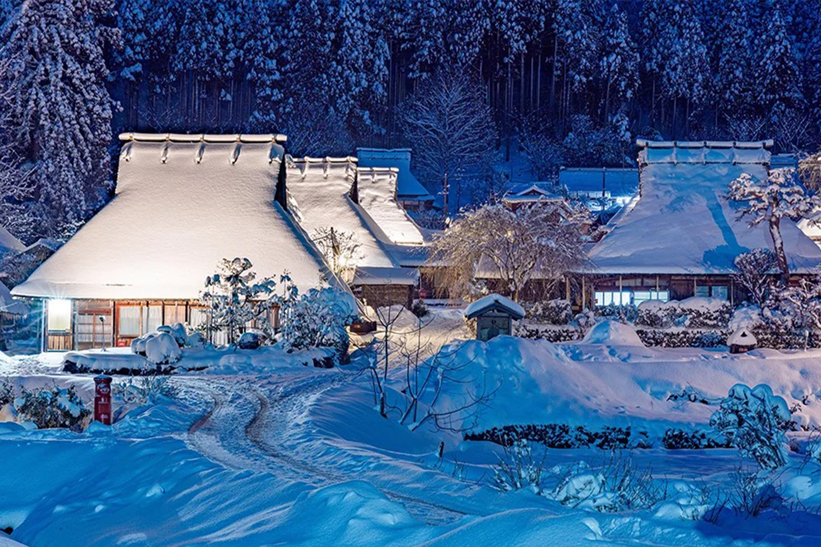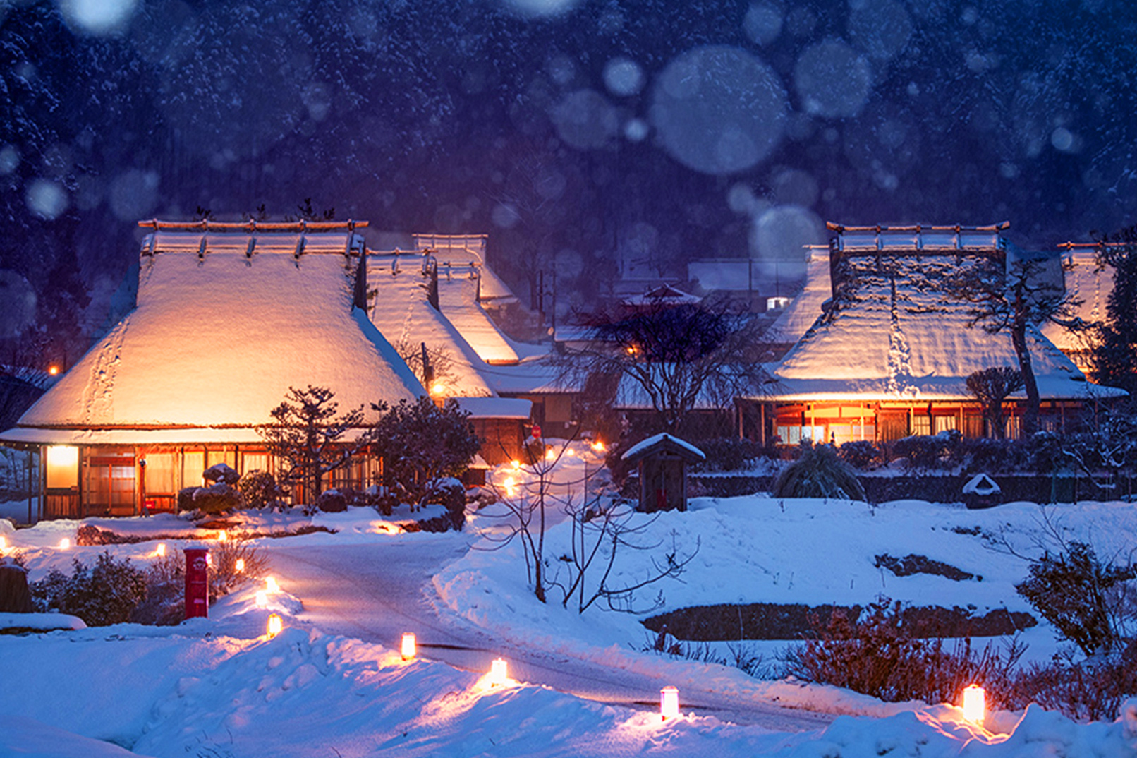 京都·山奥の伝統的なわらぶきの里、みやま·かやぶきの里で冬のシーズン限定で行われるみやま冬のランタンフェスティバルをお楽しみください。 日が暮れると、雪灯籠や路地灯籠、LED電灯、紙灯籠など、様々な灯りが村のあちこちに灯り、藁葺き屋根の村全体がほのかな光で染まります。 昼間は静かだった路地が夜になると暖かい雰囲気に変わり、冬にしか見られない幻想的な夜景を楽しむことができます。 2026年には1月19日(月)から1月23日(金)まで行われ、日付が合えば1月21日には由緒ある神社で奉献日本舞踊公演も鑑賞できます。