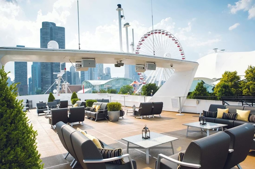 食事(しょくじ)の後(あと)は、屋外(おくがい)の屋上(おくじょう)デッキに上(あ)がってみましょう。プロのDJが贈(おく)る音楽(おんがく)に身(み)を任(まか)せたり、涼(すず)しい湖(みずうみ)の風(かぜ)を浴(あ)びながら360度(ど)に広(ひろ)がるシカゴの全景(ぜんけい)を背景(はいけい)に写真(しゃしん)を撮(と)ることができます。