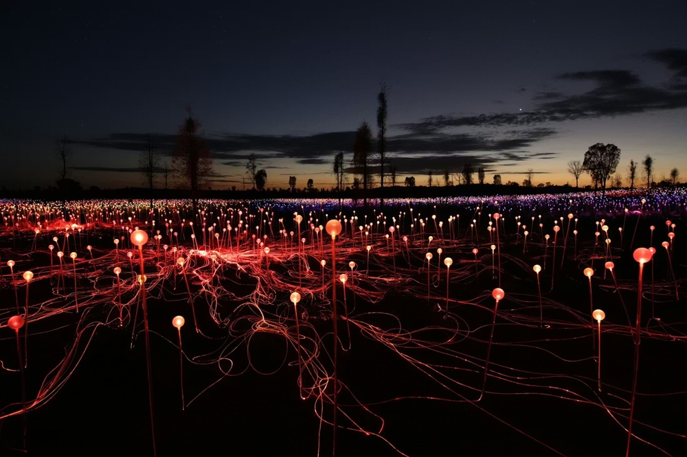 オーストラリアの巨大なへそ、ウルルの夕暮れが深まると、大地はようやく新たな生命力を得ます。イギリスのインスタレーションアーティスト、ブルース・マンローの手によって誕生したフィールド・オブ・ライトは、単なる展示を超え、自然と芸術が一体となって息づく驚くべき瞬間をプレゼントします。