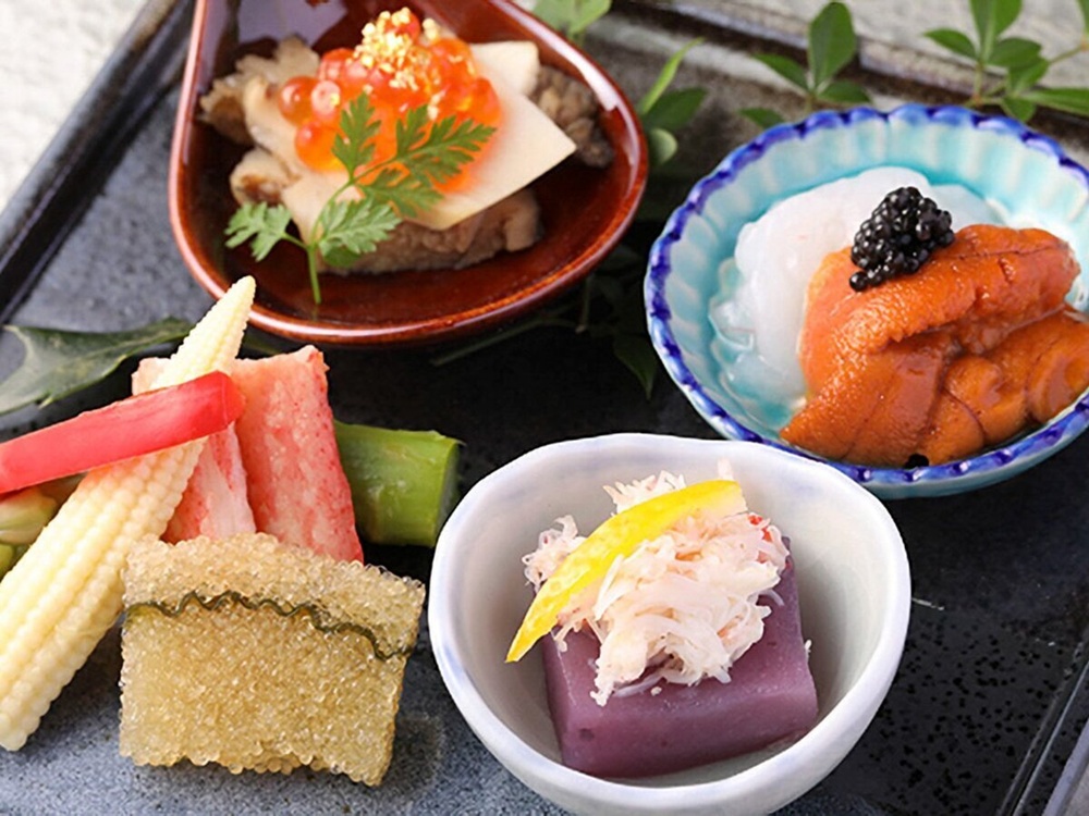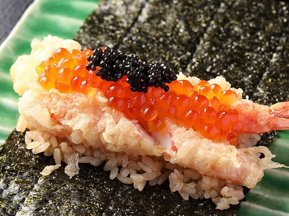 海老、蟹、イクラ、キャビアを添えた天ぷらロール