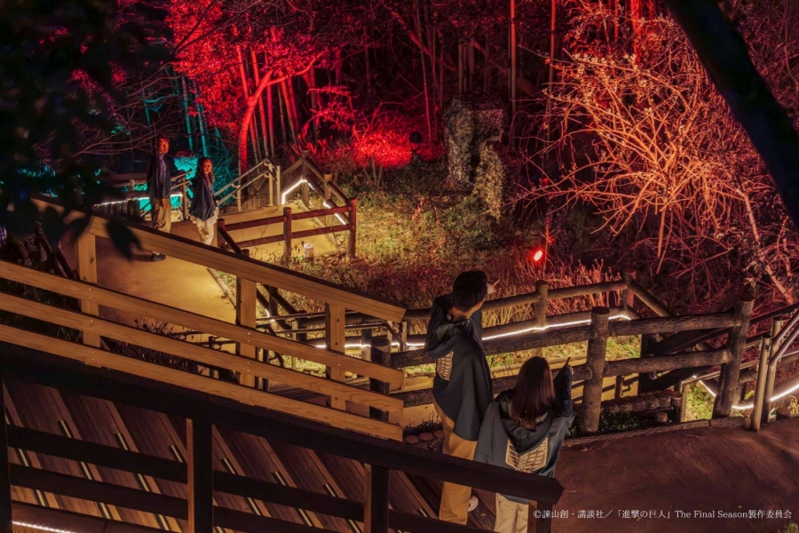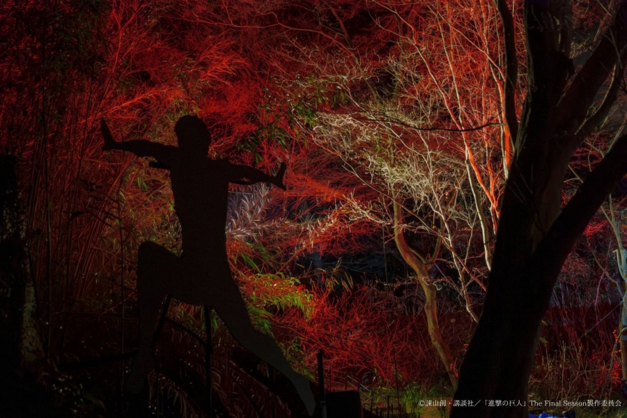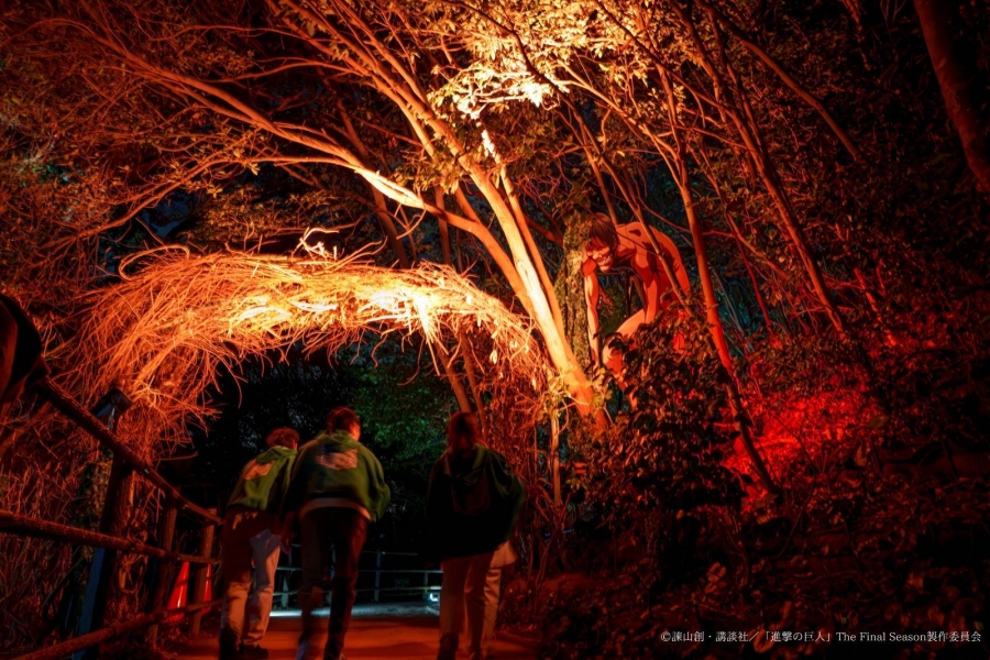 1.2kmの森の小道が、華やかな光の演出とダイナミックなプロジェクションマッピングで彩られます。エレンや仲間たちの声に導かれながら夜の森を探検し、「進撃の巨人」の世界の主人公になりきりましょう。