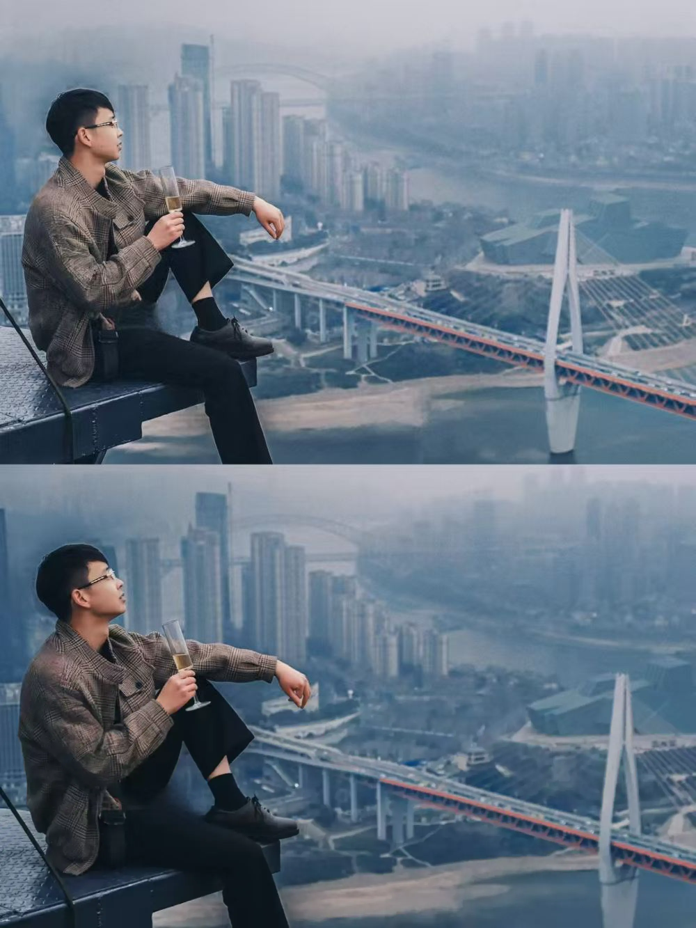プロの安全装備を着用し、空中にぶら下がった状態で新しいポーズに挑戦してみてください。片手で髪をかき上げたり、川風に服の裾をなびかせながら笑顔でカメラを見つめる瞬間、あなたは重慶のスカイラインと一体になります。