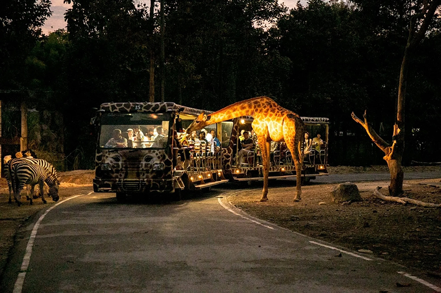 日が沈むと、動物たちの本当の時間が始まります。トラムに揺られ、月明かりの下でキリンやライオンの息遣いを間近に感じるナイトサファリは、大人も子供も夢中になれる魔法のような体験。光と音が織りなす豪華な噴水ショーも見逃せません。