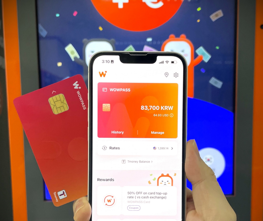 WOWPASSの最大のメリットは、複雑な銀行や両替所を探す必要がないことです。主要な地下鉄駅、ホテル、ショッピングモールに設置された無人キオスク(WOW Exchange)に自国の通貨(USD、JPY、EURなど16ヶ国通貨)を入れると、その場で韓国ウォン(KRW)にチャージされます。銀行よりも有利なレートでリアルタイムにチャージできるので、時間と費用を同時に節約できます。