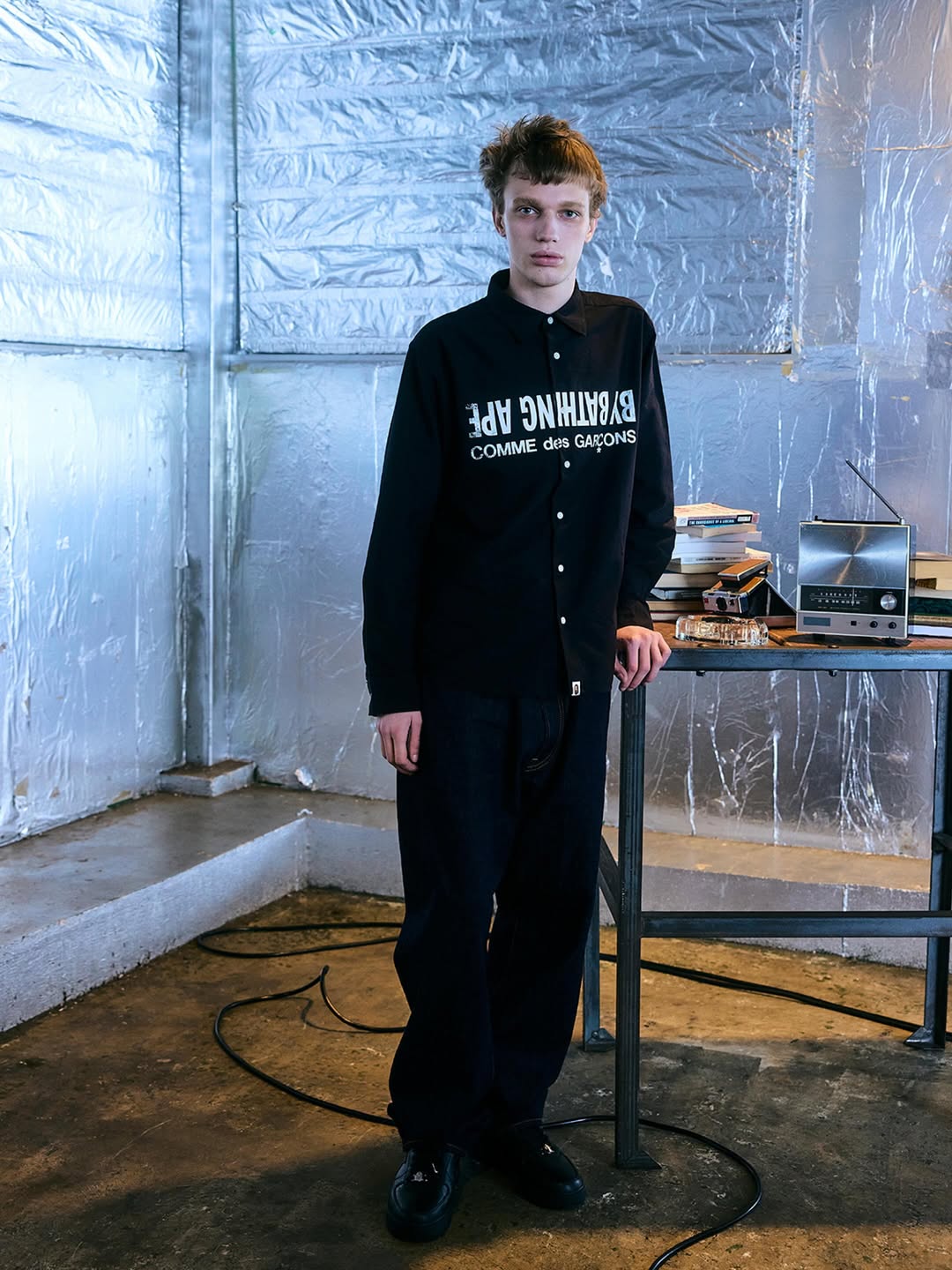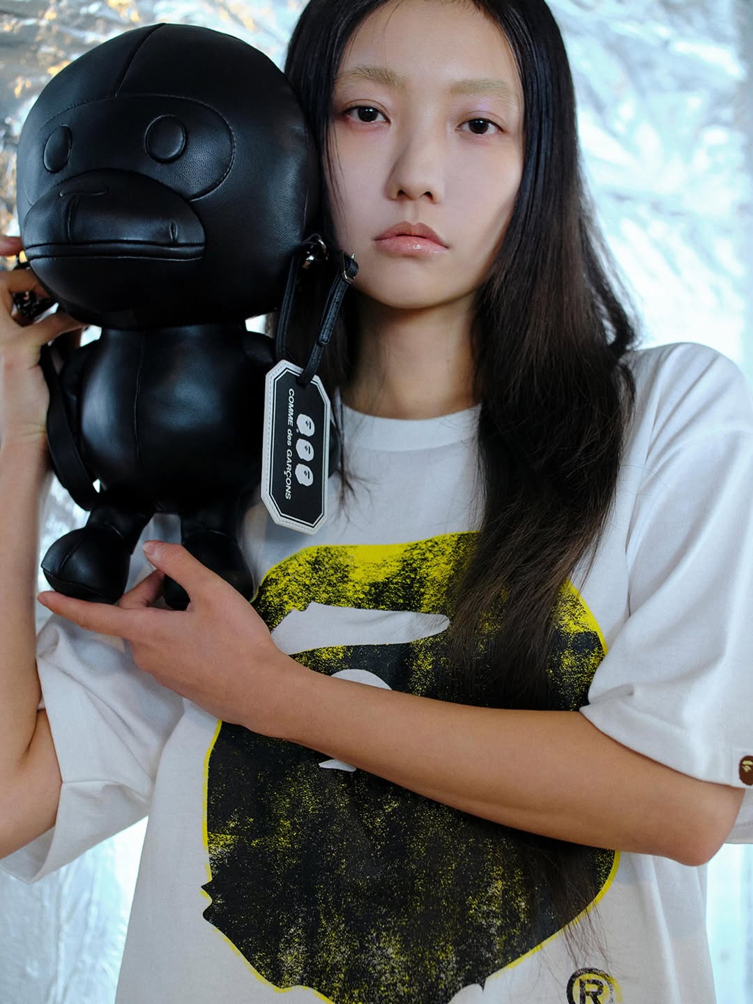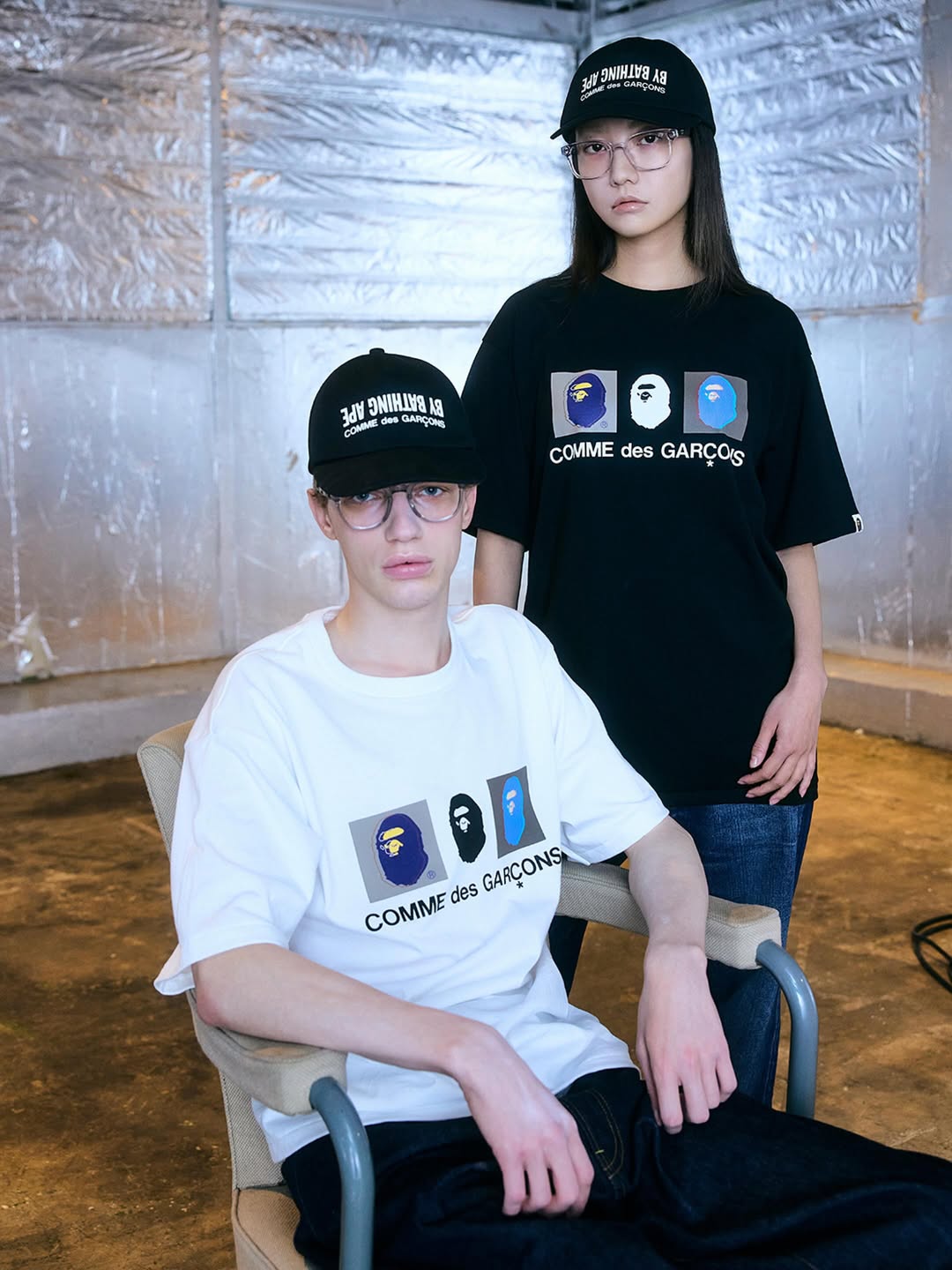 機械的な完璧さよりも、シルクスクリーン特有の粗い質感、意図的にずらされたミスプリント、そして歳月を経たかのようなフェード効果を加えることで、ヴィンテージでありながら洗練されたビジュアルを完成させています。BAPEのかわいいマスコット「ベイビーマイロ」と象徴的な「カモフラージュ」パターンが、COMME des GARÇONSの脱構築的な感性と出会い、これまでにない新しいエネルギーを放っています。